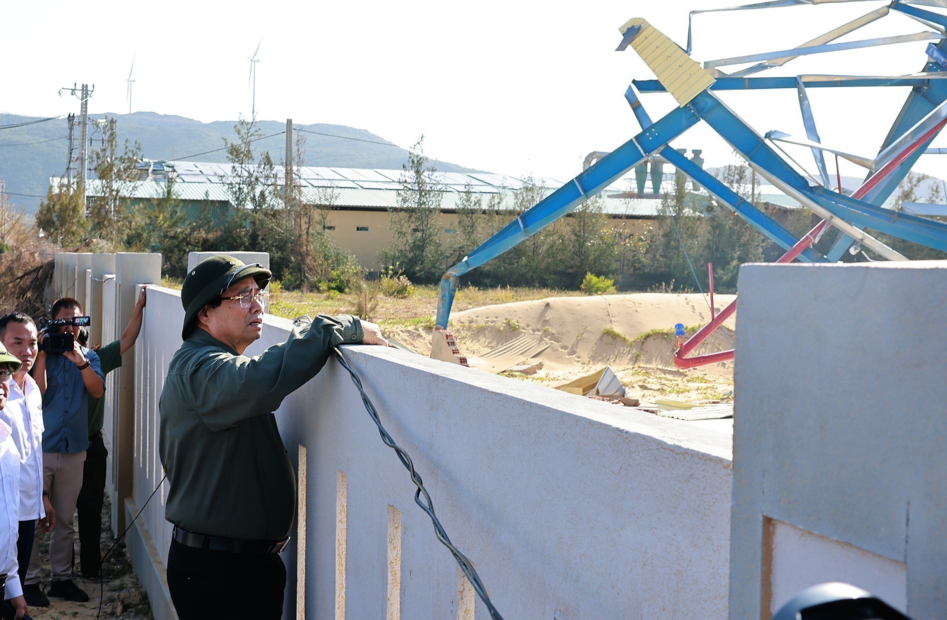 Thủ tướng Phạm Minh Chính kiểm tra các cơ sở sản xuất bị thiệt hại do bão số 13 tại Khu kinh tế Nhơn Hội. Ảnh: Dương Giang-TTXVN