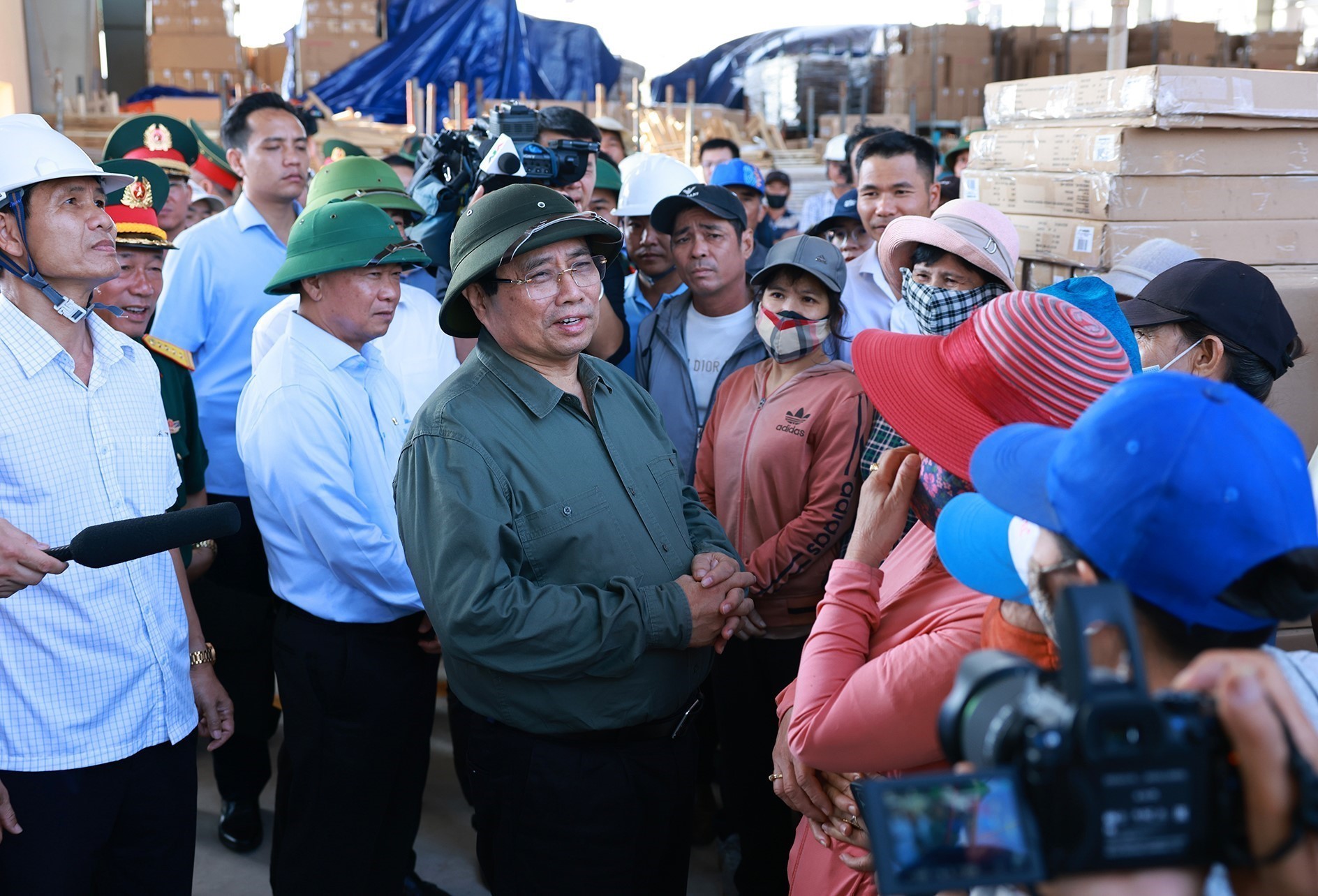 Thủ tướng Phạm Minh Chính thăm các cơ sở sản xuất bị thiệt hại do bão số 13 tại Khu kinh tế Nhơn Hội. Ảnh: Dương Giang-TTXVN