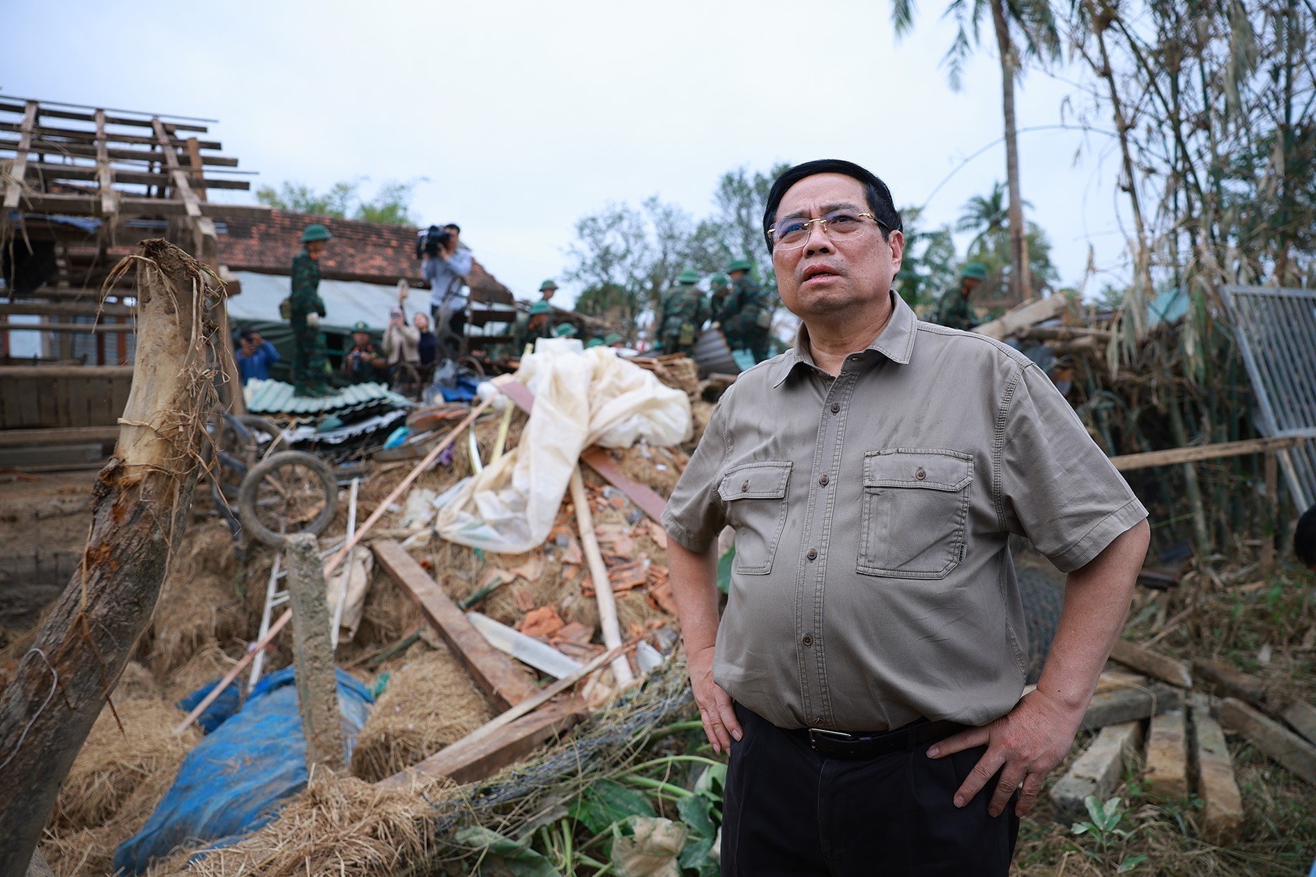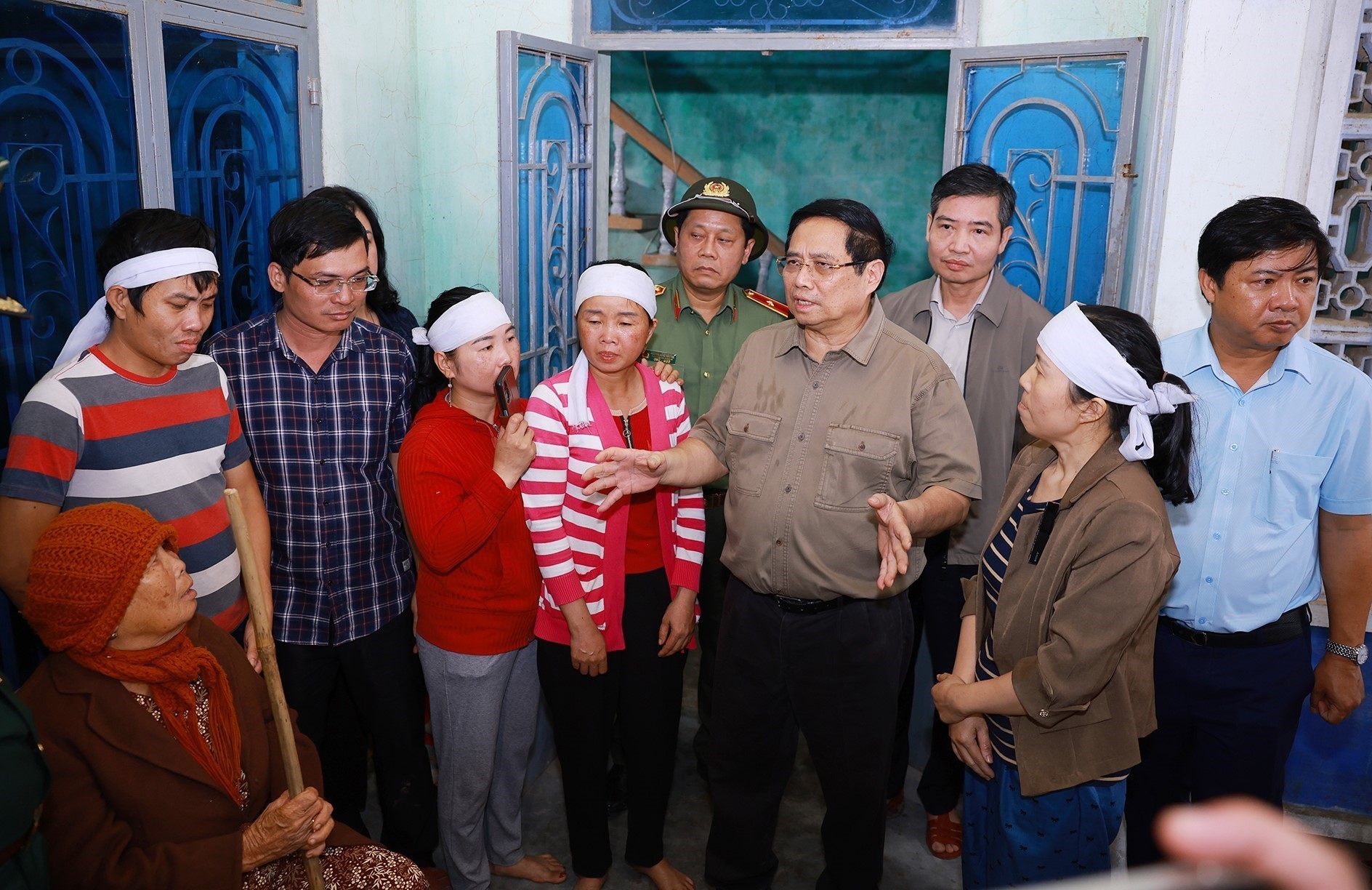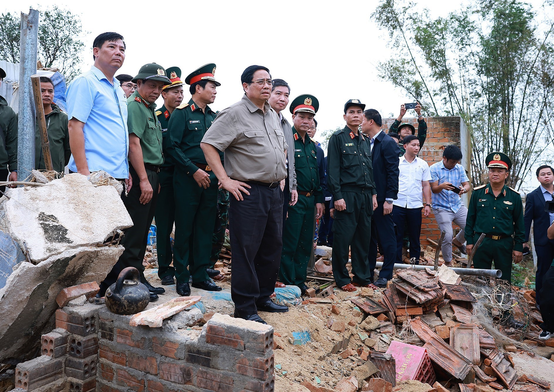Thủ tướng Phạm Minh Chính thăm, động viên hộ gia đình có nhà bị sập hoàn toàn tại thôn Phú Hữu, xã Hòa Thịnh. Ảnh: Dương Giang-TTXVN