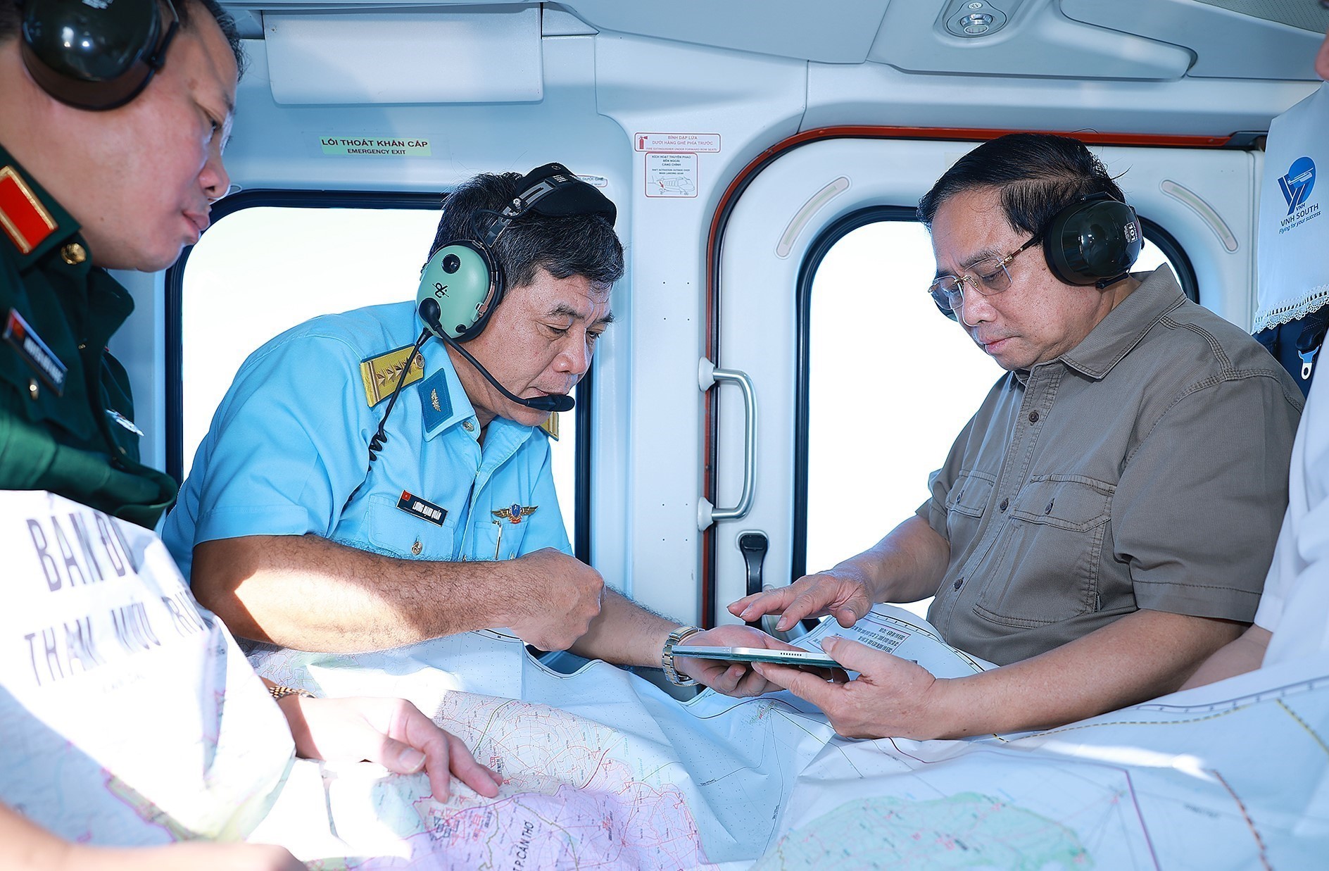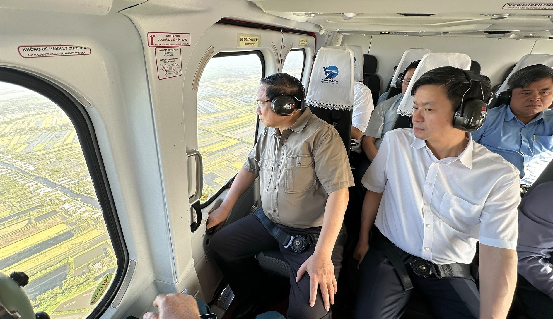 Thủ tướng Phạm Minh Chính thị sát, kiểm tra tuyến đường bộ cao tốc Cà Mau – Đất Mũi, tuyến giao thông ra đảo Hòn Khoai và Cảng tổng hợp lưỡng dụng Hòn Khoai từ trực thăng. Ảnh: Dương Giang-TTXVN
