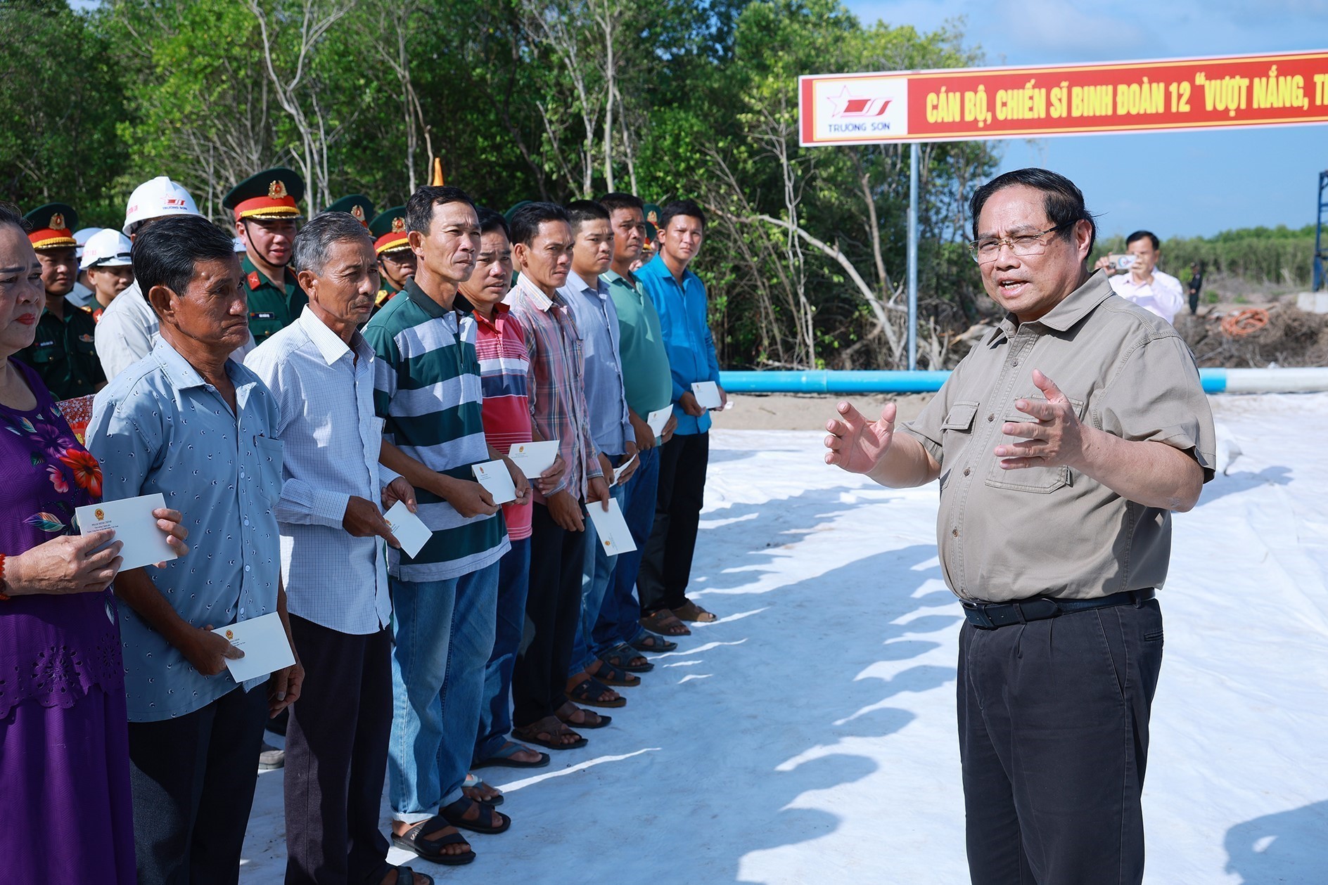 Thủ tướng Phạm Minh Chính với nhân dân khu vực dự án tuyến đường bộ cao tốc Cà Mau – Đất Mũi, tuyến giao thông ra đảo Hòn Khoai và Cảng tổng hợp lưỡng dụng Hòn Khoai. Ảnh: Dương Giang-TTXVN