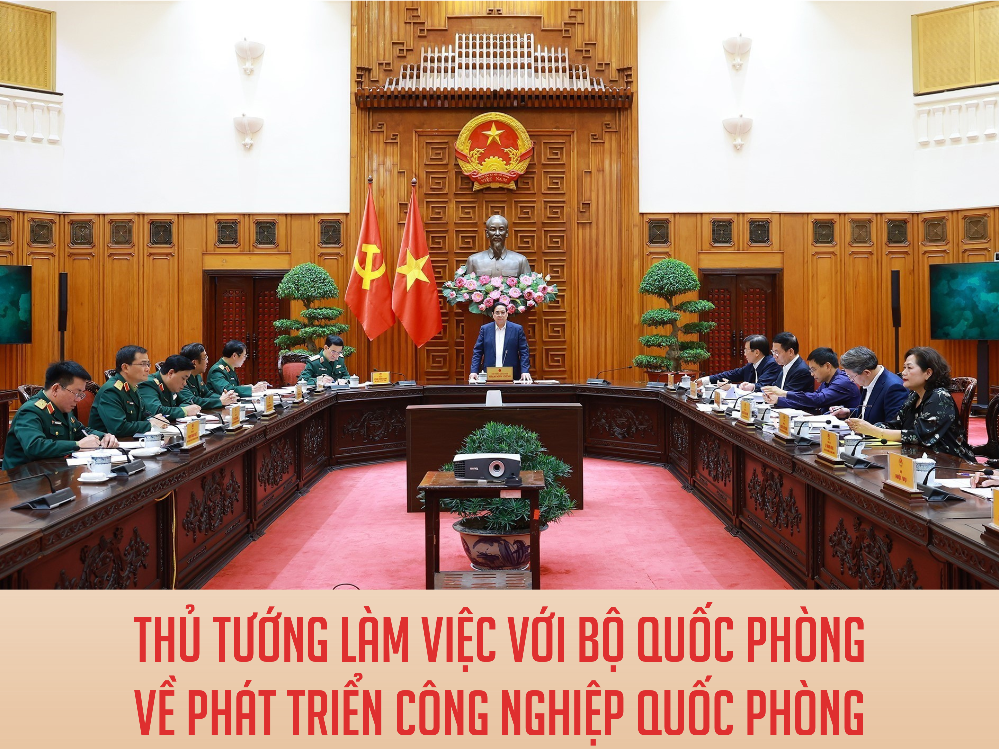 Chiều 24/12/2025, tại Hà Nội, Thủ tướng Phạm Minh Chính chủ trì làm việc với lãnh đạo Bộ Quốc phòng và các bộ, ngành liên quan về kết quả nghiên cứu, sản xuất công nghiệp quốc phòng công nghệ cao năm 2025 và định hướng các nhiệm vụ trọng tâm năm 2026.