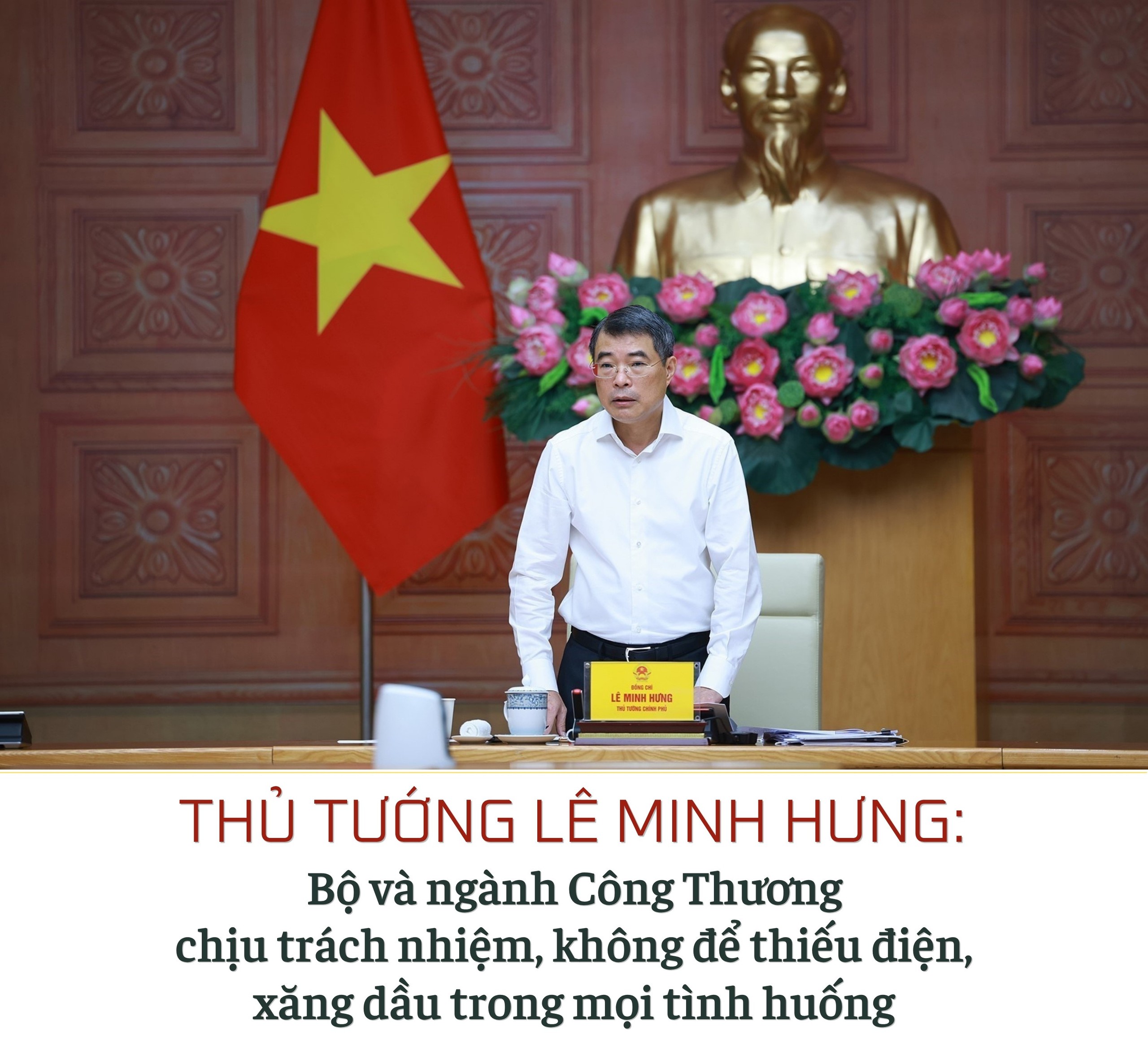 Thủ tướng nhấn mạnh yêu cầu bảo đảm an ninh năng lượng và chuyển dịch năng lượng công bằng, chỉ rõ, Bộ, ngành Công Thương chịu trách nhiệm không để thiếu điện, xăng dầu trong mọi tình huống. Các bên liên quan khẩn trương rà soát, cập nhật, bổ sung quy hoạch Điện VIII, bổ sung các dự án điện nền theo công nghệ mới, đẩy nhanh tiến độ các dự án điện; phối hợp chặt chẽ với Bộ Nông nghiệp và Môi trường trong vận hành hiệu quả, tối ưu hóa các hồ thủy điện; khẩn trương xây dựng phương án rà soát, tái cơ cấu hệ thống kinh doanh, phân phối xăng dầu theo hướng giảm khâu trung gian, giảm chi phí; khẩn trương triển khai xây dựng kho dự trữ xăng dầu quốc gia; đẩy nhanh việc sử dụng xăng E10.