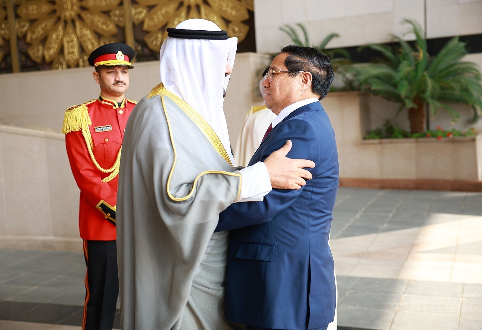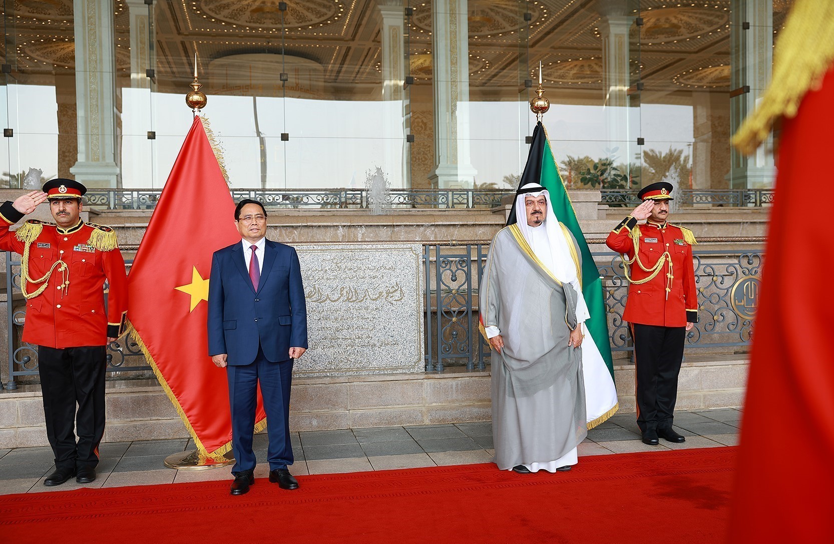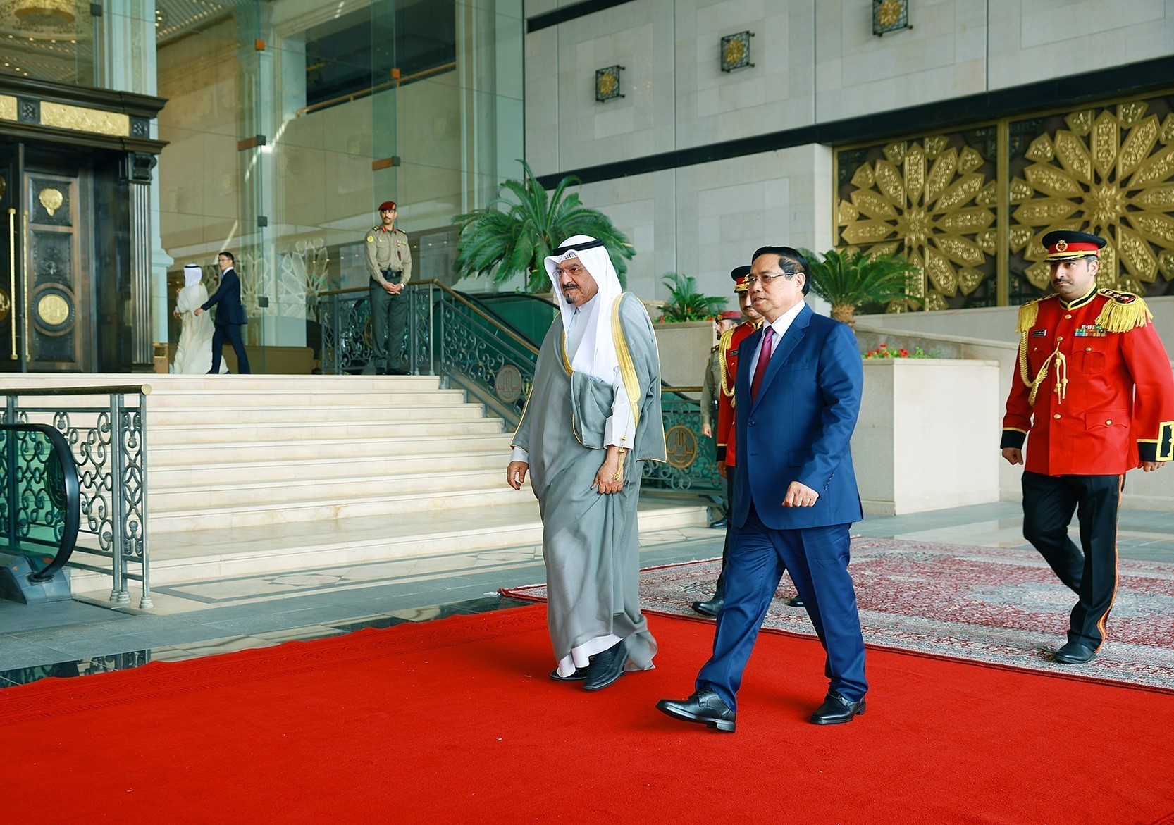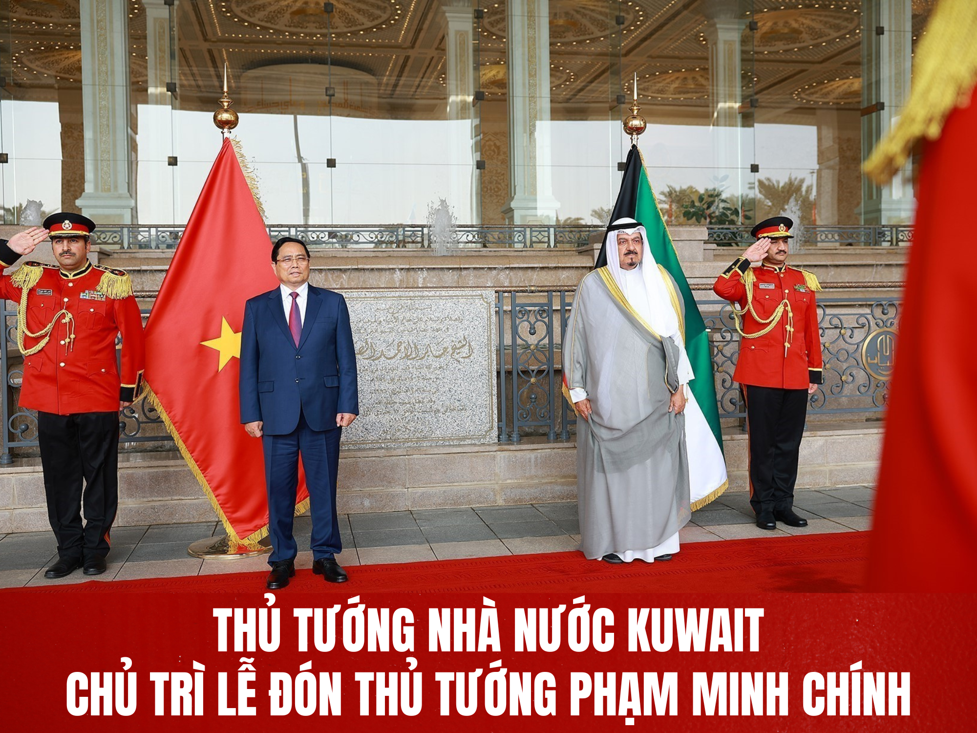 Sáng 17/11 theo giờ địa phương, tại Cung Bayan của Hoàng gia ở thủ đô Kuwait, Thủ tướng Nhà nước Kuwait Sheikh Ahmad Abdullah Al-Ahmad Al Sabah chủ trì lễ đón Thủ tướng Chính phủ Phạm Minh Chính và Đoàn đại biểu cấp cao Việt Nam thăm chính thức Kuwait.