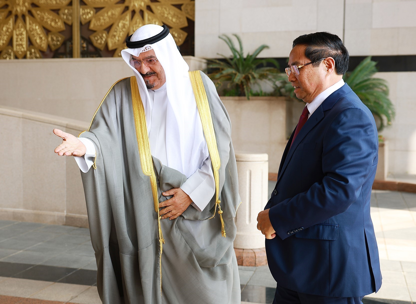 Thủ tướng Nhà nước Kuwait Sheikh Ahmad Abdullah Al-Ahmad Al Sabah đón Thủ tướng Phạm Minh Chính thăm chính thức Kuwwait. Ảnh: Dương Giang-TTXVN