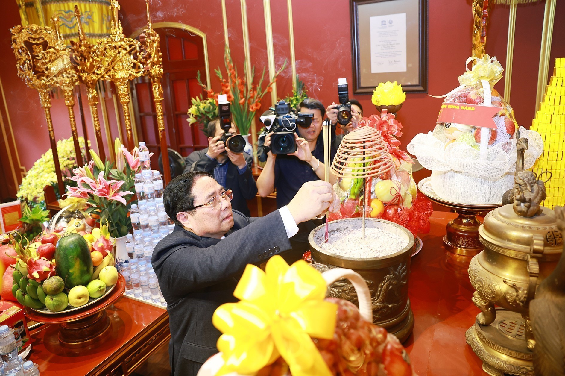 Trong không khí linh thiêng của những ngày giáp Tết, Thủ tướng Chính phủ Phạm Minh Chính và các đại biểu đã dâng hương tỏ lòng thành kính tưởng niệm, tri ân công đức các bậc tiền nhân đã khai mở nền văn hiến Thăng Long, khai sáng văn minh Đại Việt; cẩn cáo về những thành quả xây dựng, phát triển đất nước; đồng thời cầu mong cho các bậc tiền nhân, tiên hiền phù hộ cho quốc thái dân an, nhân dân ấm no, hạnh phúc.