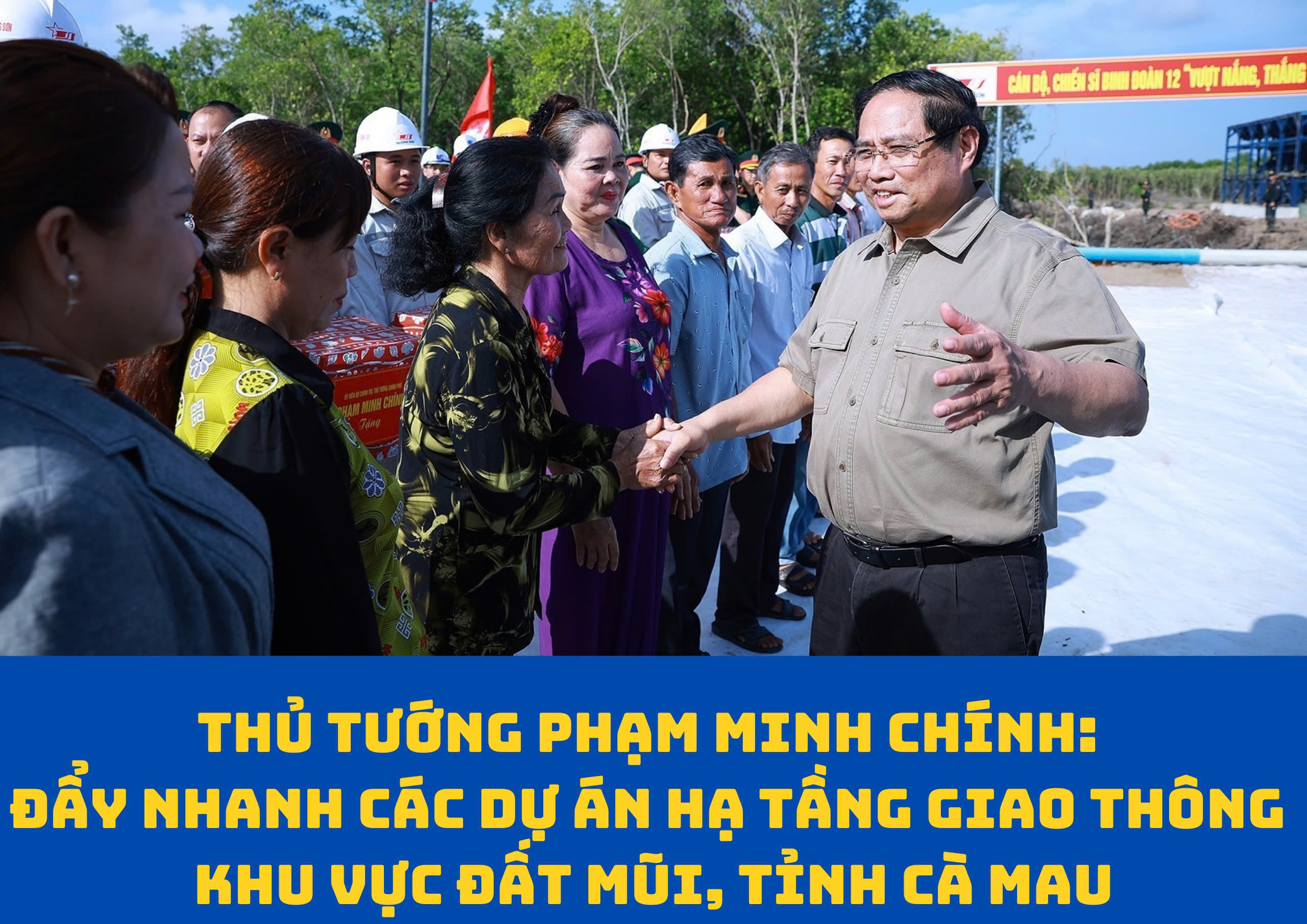 Thăm tặng quà lực lượng thi công và người dân tại điểm đầu xây dựng tuyến giao thông ra đảo Hòn Khoai, Thủ tướng Chính phủ Phạm Minh Chính hoan nghênh, đánh giá cao, cảm ơn bà con đã nhường đất cho dự án; các lực lượng thi công đã nỗ lực bám công trường, khắc phục khó khăn về địa hình, địa chất, tổ chức thi công 3 ca, 4 kíp, vượt nắng, thắng mưa để đẩy nhanh tiến độ dự án, tất cả vì lợi ích quốc gia dân tộc, lợi ích của nhân dân.