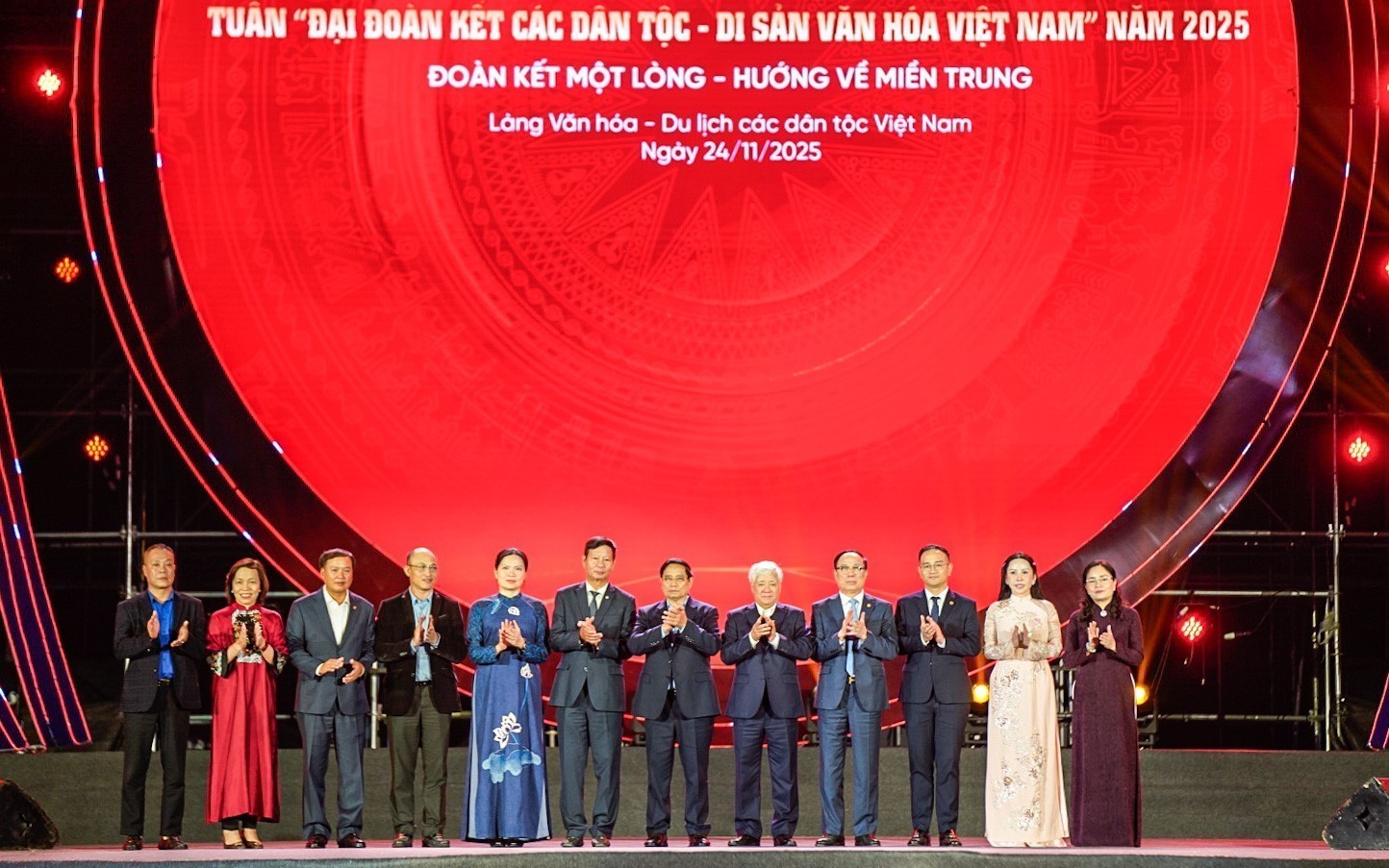 Tối 24/11/2025, tại Làng Văn hóa - Du lịch các dân tộc Việt Nam (Đồng Mô, Hà Nội), trong khuôn khổ Tuần “Đại đoàn kết các dân tộc - Di sản Văn hóa Việt Nam” năm 2025 (18 - 24/11/2025) diễn ra Chương trình nghệ thuật "Đoàn kết một lòng - Hướng về miền Trung". Thủ tướng Chính phủ Phạm Minh Chính tới dự và phát biểu.