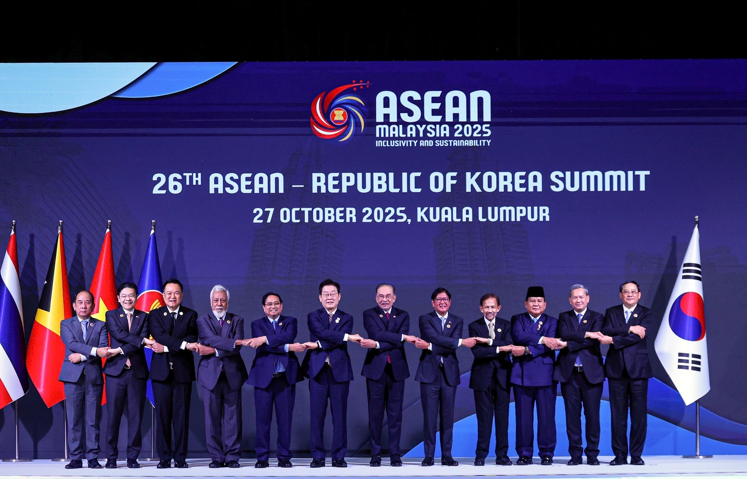 Thủ tướng Phạm Minh Chính và Trưởng đoàn các nước ASEAN cùng Tổng thống Hàn Quốc Lee Jae Myung chụp ảnh chung tại Hội nghị Cấp cao ASEAN - Hàn Quốc lần thứ 26. Ảnh: Dương Giang-TTXVN