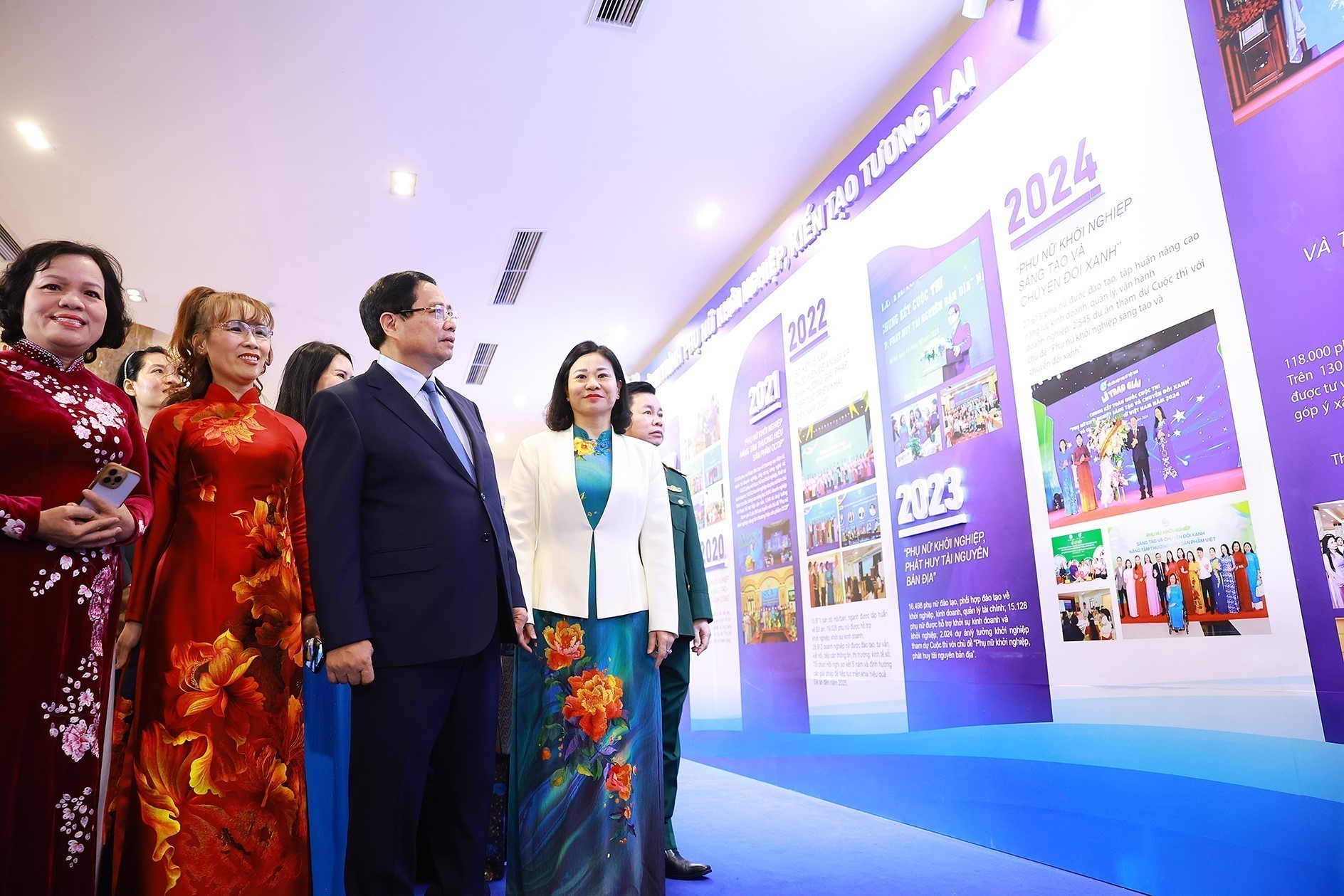 Thủ tướng Phạm Minh Chính tham quan trưng bày về quá trình phát triển Đề án “Hỗ trợ phụ nữ khởi nghiệp giai đoạn 2017-2025” . Dương Giang-TTXVN