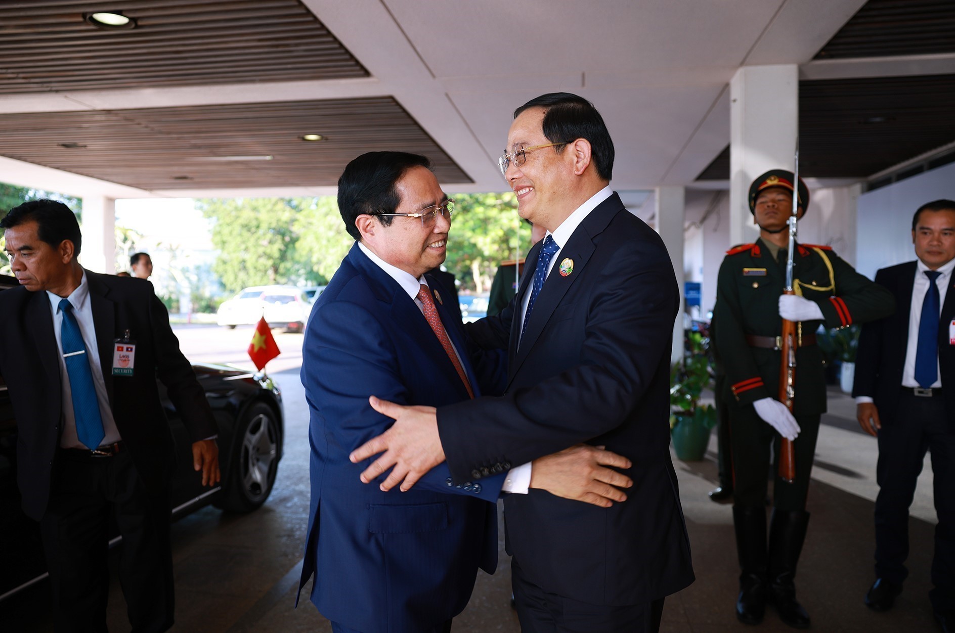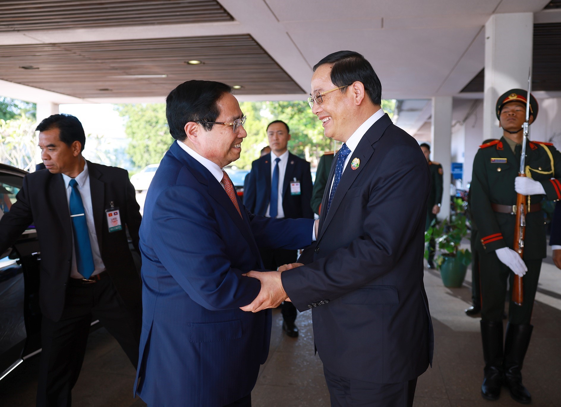 Thủ tướng Lào Sonexay Siphandone đón Thủ tướng Phạm Minh Chính đến Hội nghị xúc tiến đầu tư Việt Nam - Lào năm 2025