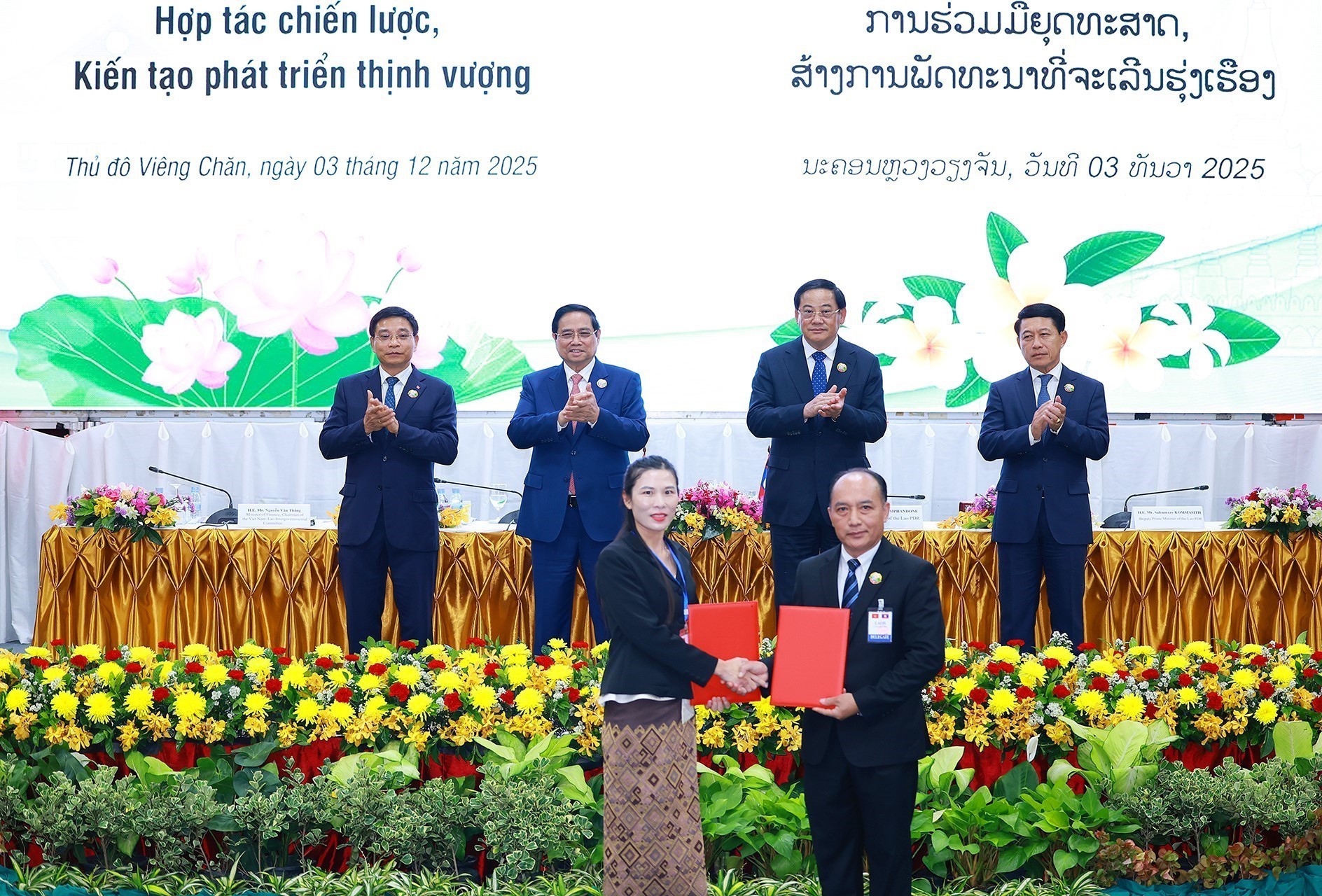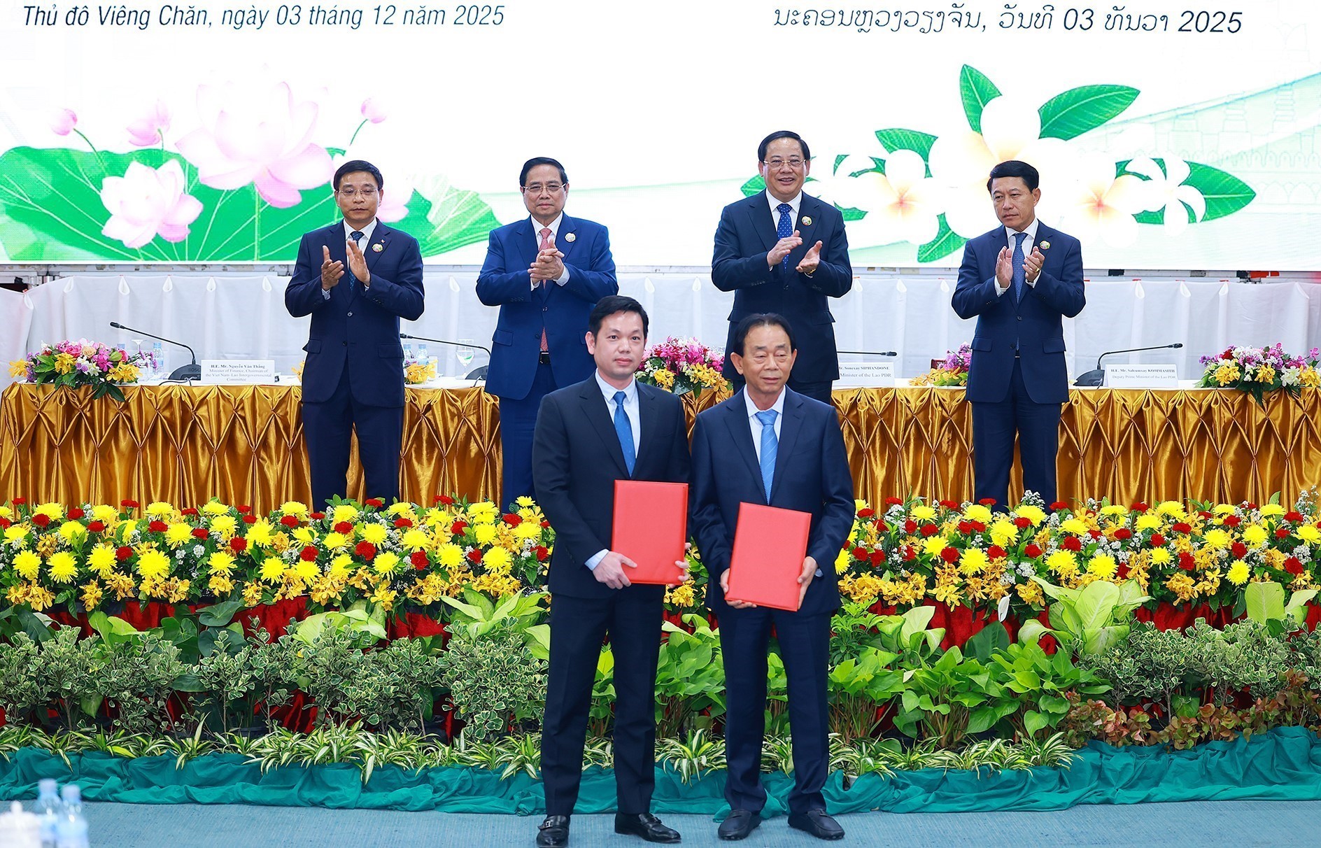 Chiều 3/12/2025, tại thủ đô Vientiane, Thủ tướng Phạm Minh Chính và Thủ tướng Lào Sonexay Siphandone tham dự Hội nghị xúc tiến đầu tư Việt Nam - Lào năm 2025.
