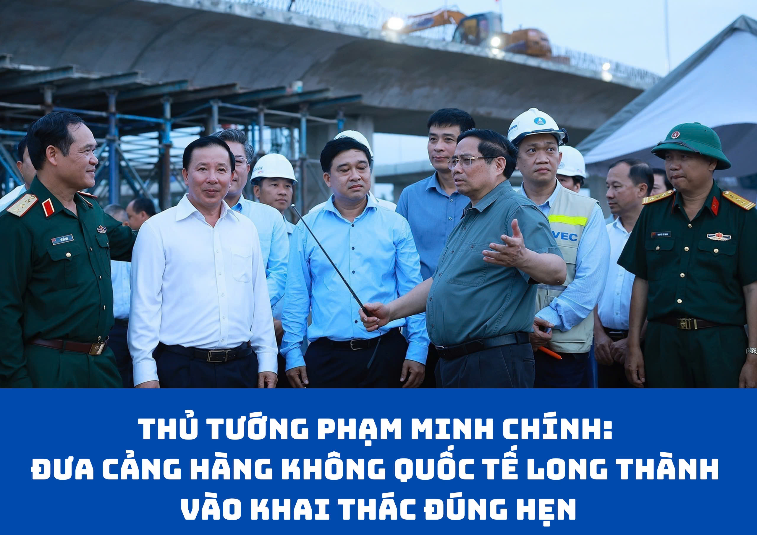 Kiểm tra, động viên các lực lượng đang thi công trên công trường, Thủ tướng Phạm Minh Chính biểu dương, cảm ơn các đơn vị, nhà thầu, đặc biệt là hơn 15.000 chuyên gia, kỹ sư, công nhân đang ngày đêm cùng 3.000 máy móc, thiết bị hối hả thi công, đẩy nhanh tiến độ để vận hành, đón chuyến bay đầu tiên vào ngày 19/12 và đưa Cảng hàng không quốc tế Long Thành vào khai thác thương mại vào nửa đầu năm 2026.