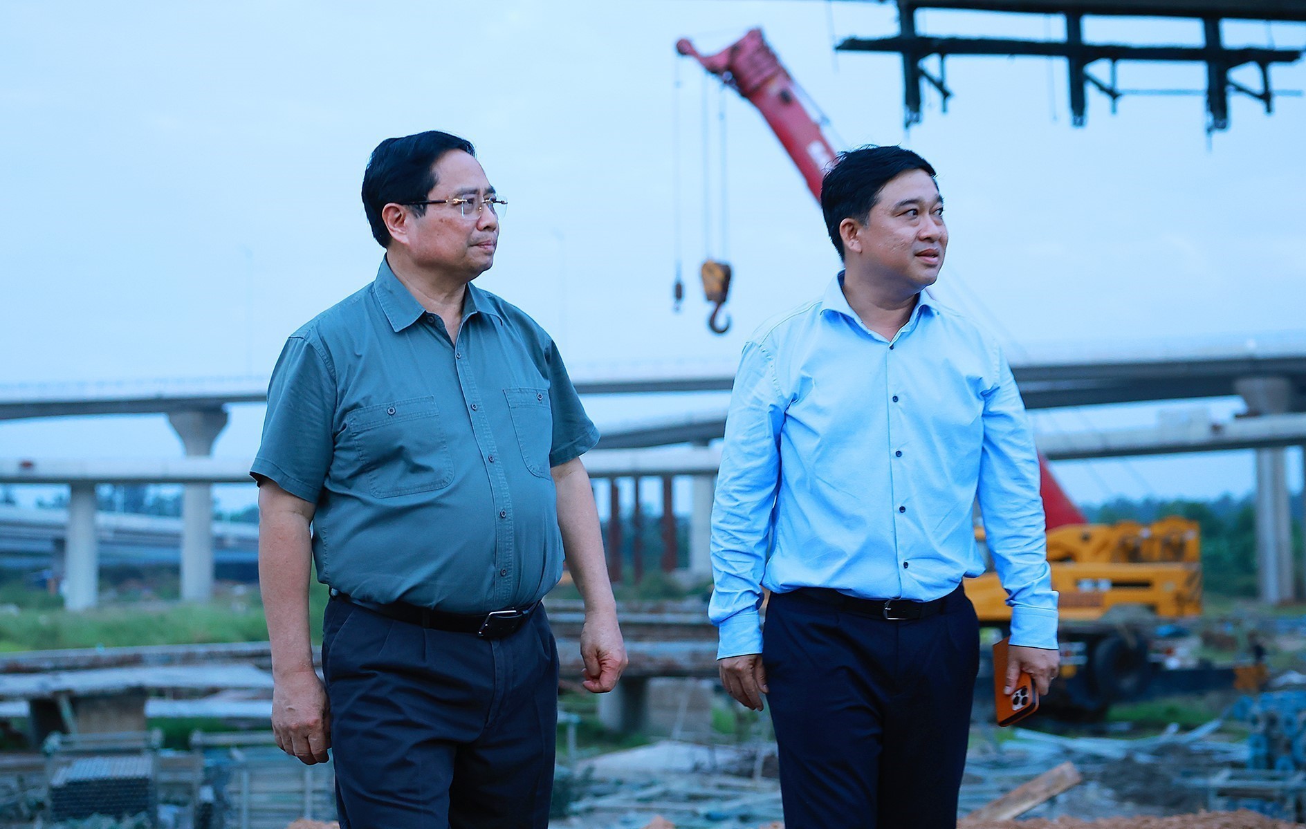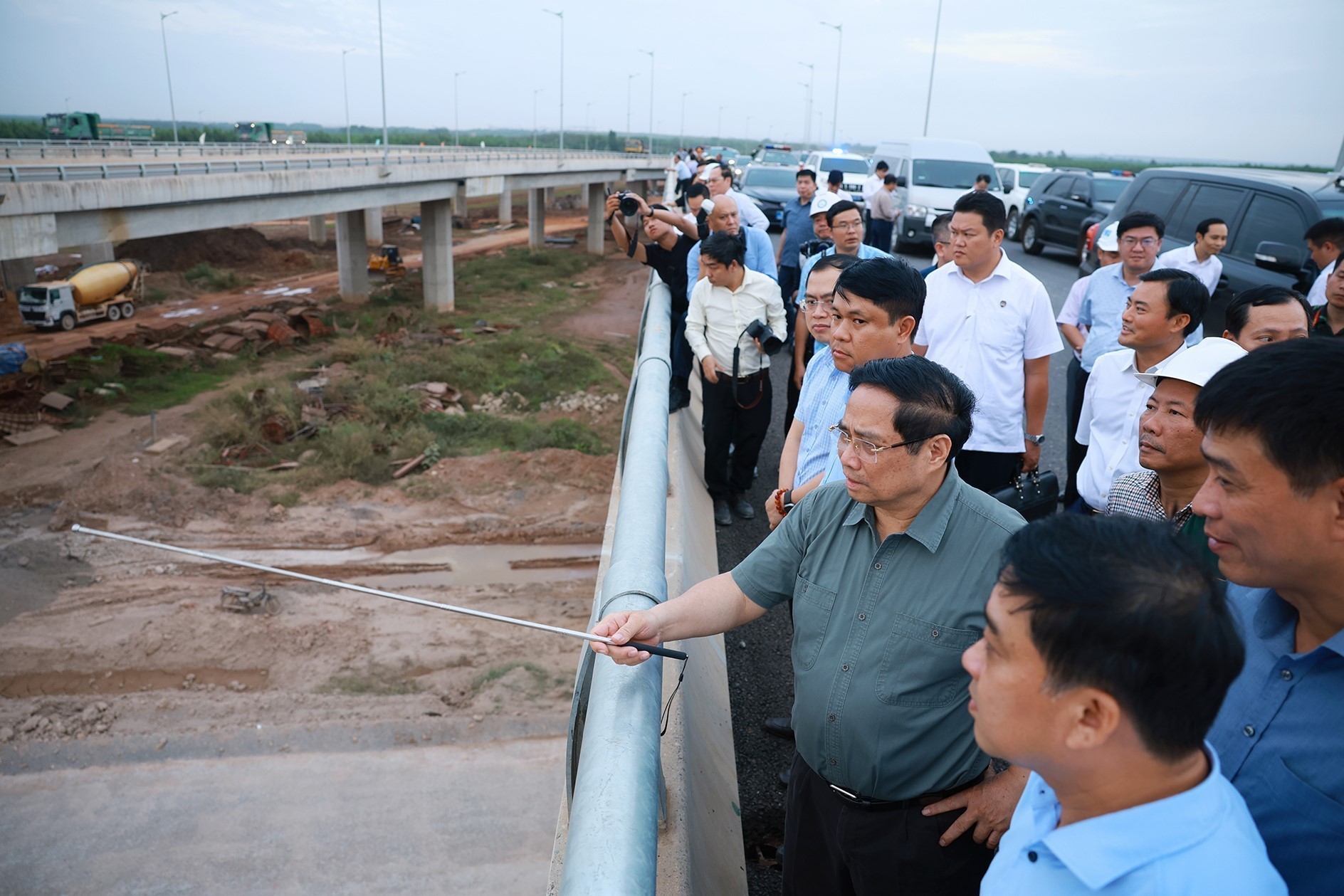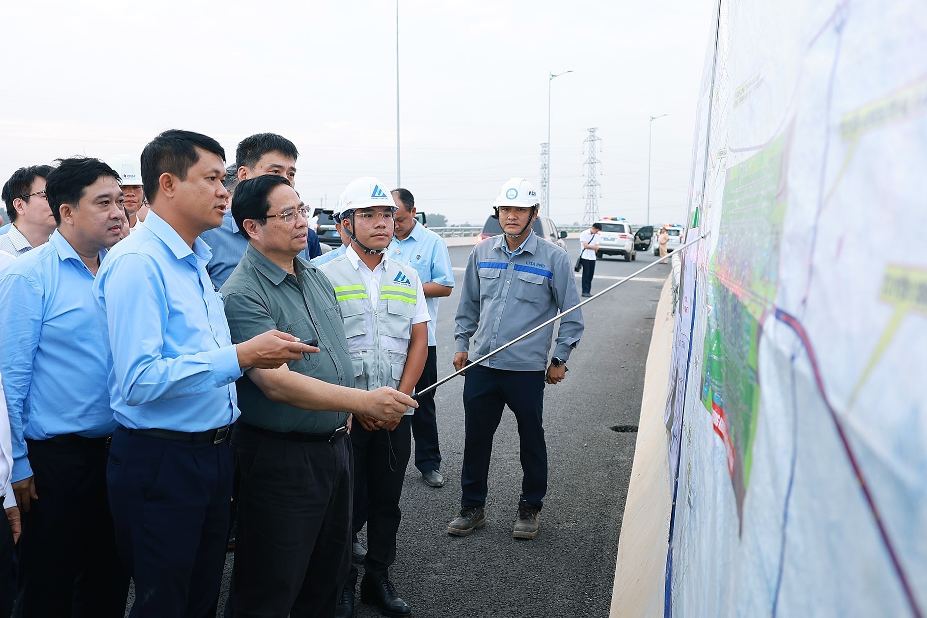 Thủ tướng Phạm Minh Chính kiểm tra thi công nút giao với Sân bay Long Thành (Dự án thành phần 1 và Dự án thành phần 2 thuộc Dự án cao tốc Biên Hòa - Vũng Tàu). Ảnh: Dương Giang-TTXVN