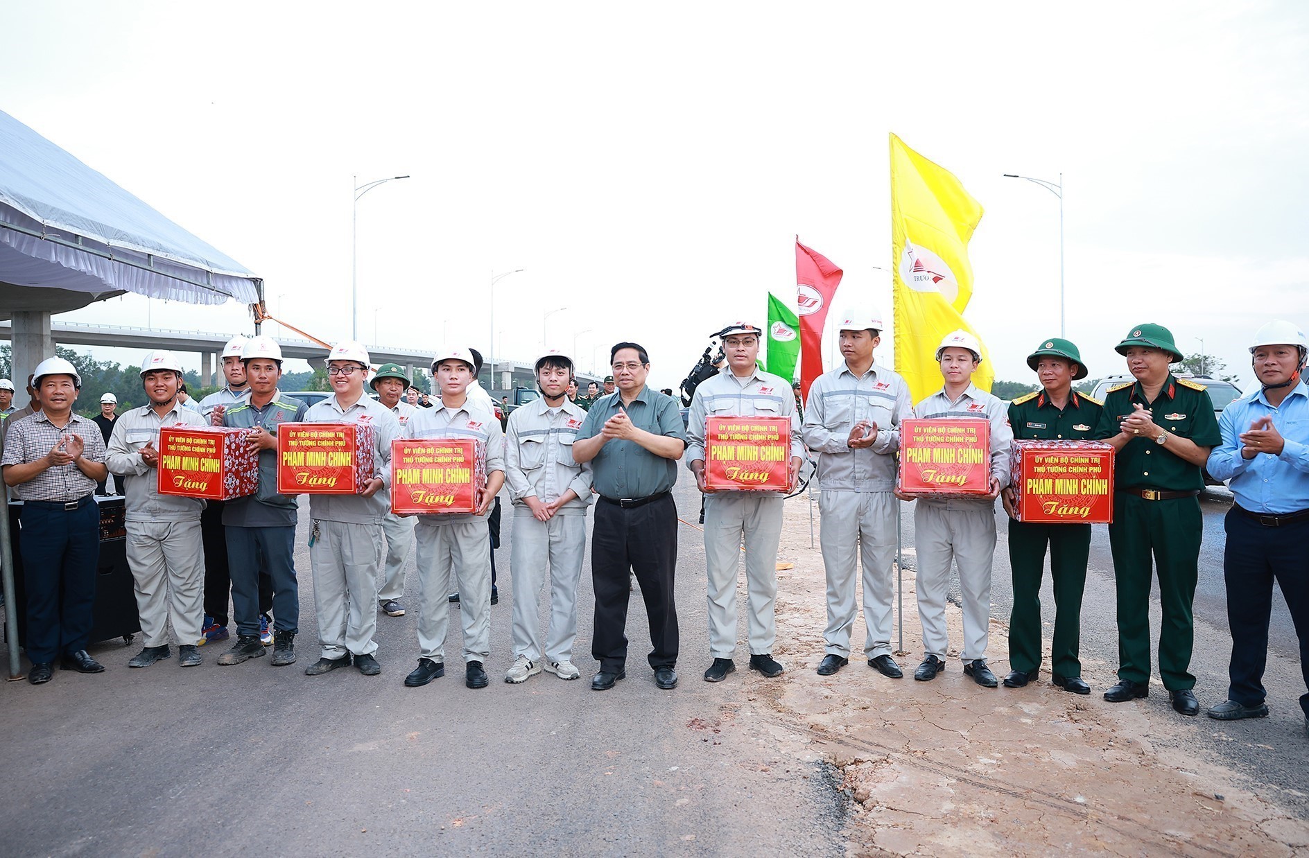 Thủ tướng Phạm Minh Chính tặng quà công nhân thi công nút giao với Sân bay Long Thành (Dự án thành phần 1 và Dự án thành phần 2 thuộc Dự án cao tốc Biên Hòa - Vũng Tàu). Ảnh: Dương Giang-TTXVN