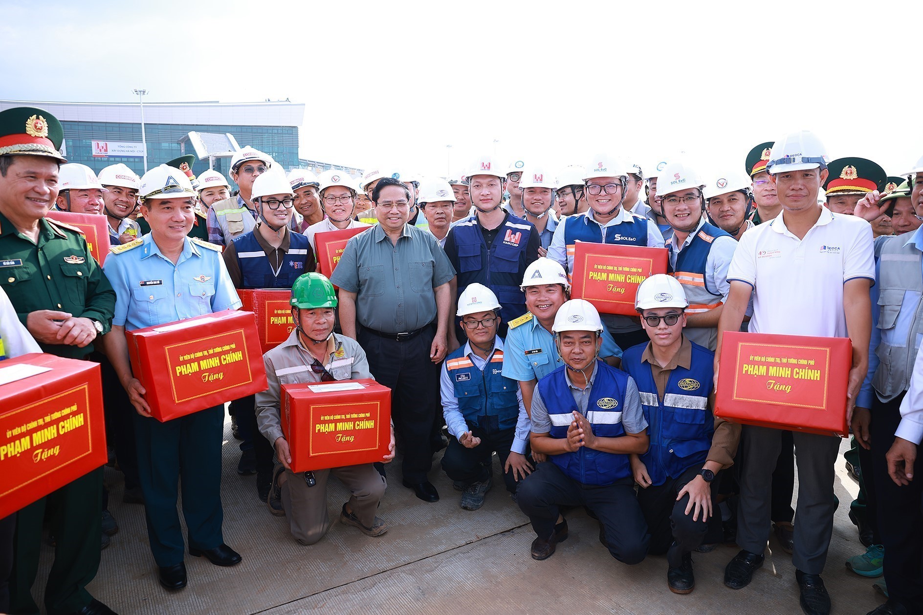 Thủ tướng Phạm Minh Chính tặng quà các đơn vị thi công Dự án cảng hàng không quốc tế Long Thành. Ảnh: Dương Giang-TTXVN