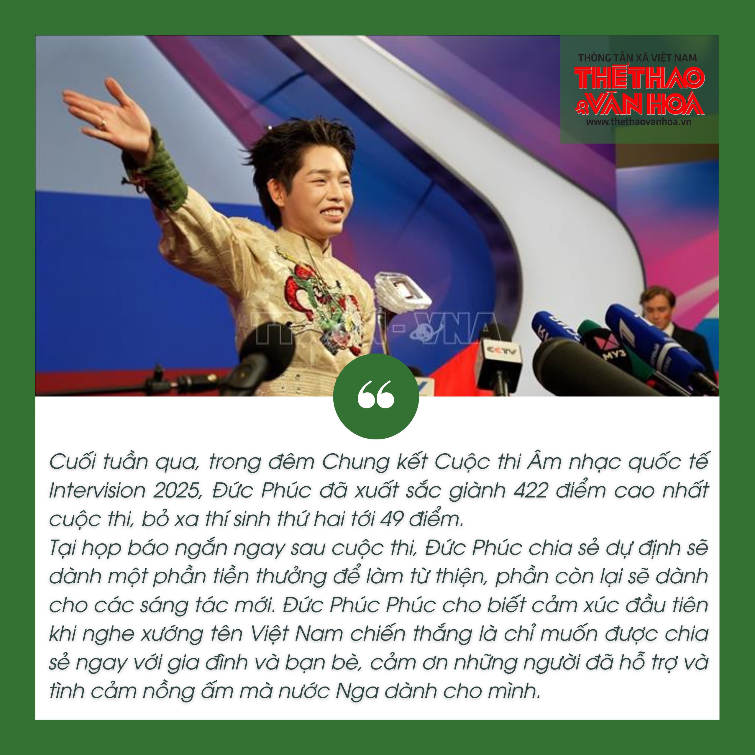 Chúng ta mong muốn và tin tưởng rằng, chiến thắng tại Intervision 2025 lần này sẽ là động lực để ca sĩ Đức Phúc nói riêng và đội ngũ văn nghệ sĩ Việt Nam nói chung tiếp tục phát huy tài năng, không ngừng sáng tạo, đóng góp tích cực cho nền âm nhạc nước nhà và quảng bá văn hóa Việt Nam ra thế giới, đồng thời tạo nguồn cảm hứng mạnh mẽ cho tuổi trẻ Việt Nam tiếp tục cống hiến và sáng tạo, đóng góp tinh hoa Việt Nam vào dòng chảy văn minh nhân loại".