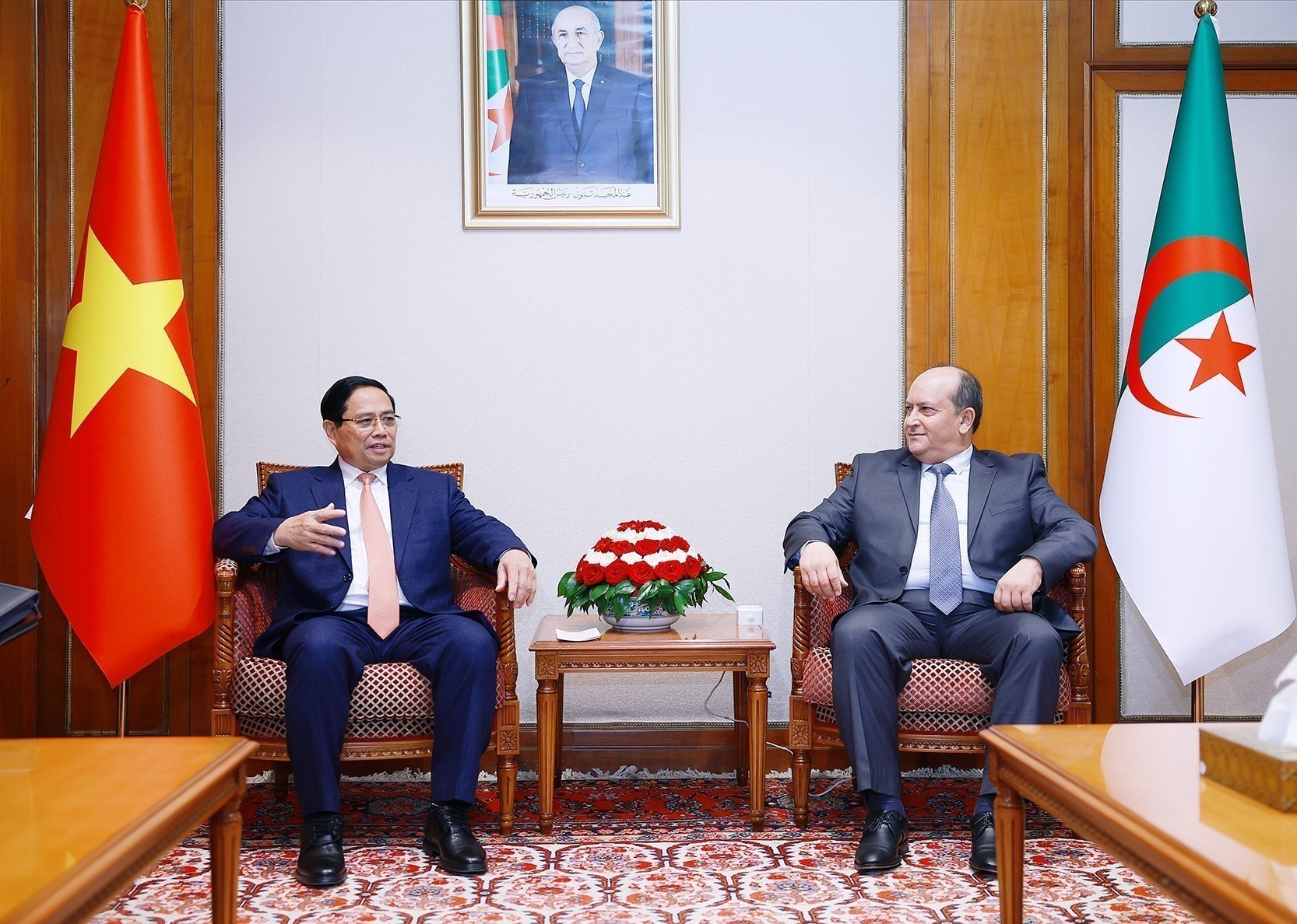 Trên tinh thần đó, Thủ tướng đề nghị hai bên phối hợp ưu tiên triển khai các nhóm giải pháp: Hai bên cần thắt chặt hơn nữa sự tin cậy chính trị, tăng cường trao đổi đoàn và dành ưu tiên cho nhau trong chính sách đối ngoại của mỗi nước; Algeria tiếp tục quan tâm, hỗ trợ Tập đoàn Công nghiệp Năng lượng Quốc gia Việt Nam (PVN) mở rộng đầu tư và hoạt động ổn định, hiệu quả, đóng góp tích cực hơn nữa vào sự phát triển của Algeria, là biểu tượng thành công cho hợp tác hai nước; Thúc đẩy hợp tác đầu tư, mở cửa thị trường hai nước cho mặt hàng thế mạnh của nhau, tăng cường trao đổi thương mại, bảo đảm cân bằng lợi ích của hai nước, trong đó Algeria hỗ trợ các doanh nghiệp Việt Nam tham gia các dự án chuyển đổi số, doanh nghiệp hai nước hợp tác trong lĩnh vực viễn thông.