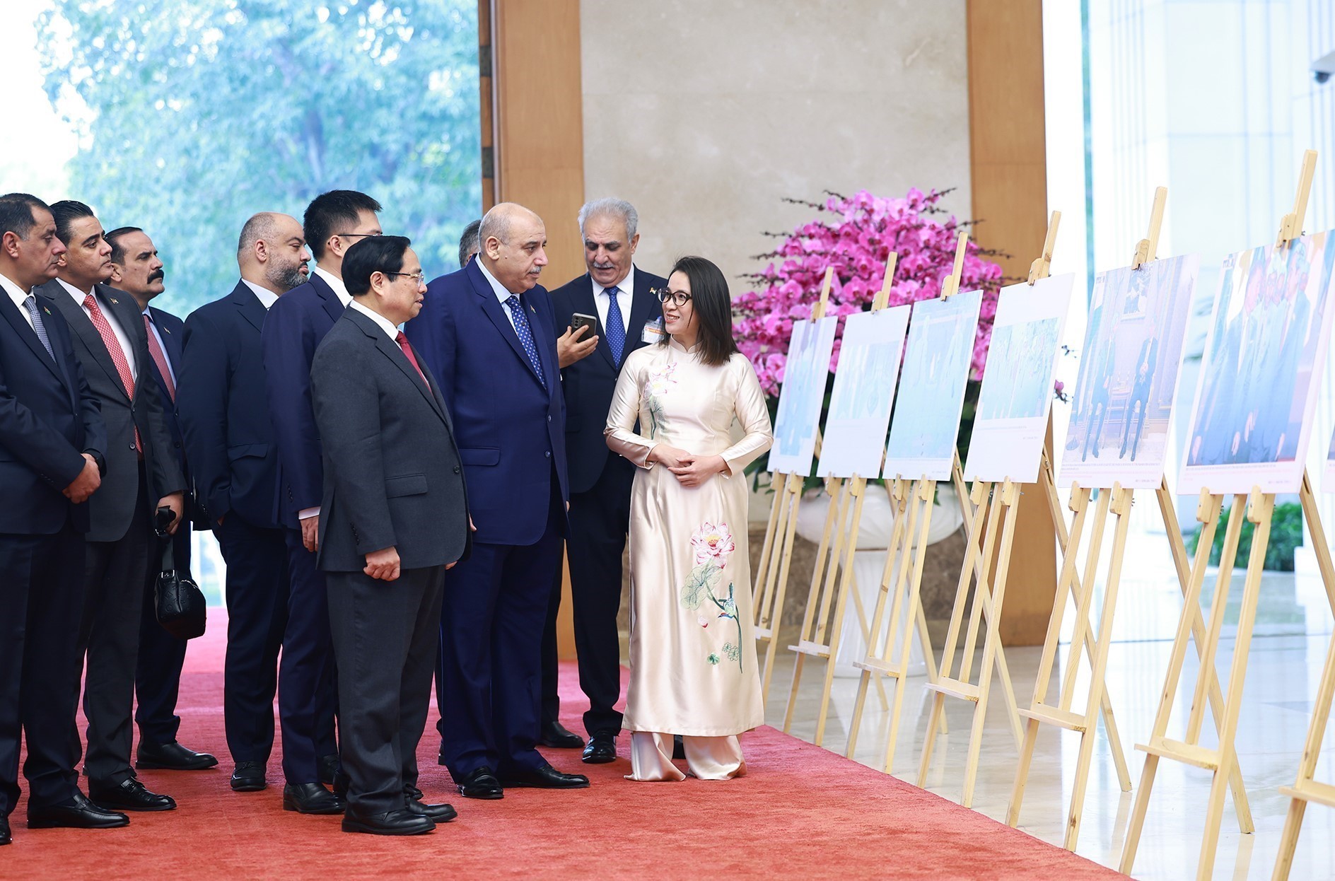 Thủ tướng Phạm Minh Chính và Chủ tịch Hạ viện Vương quốc Hashemite Jordan Mazen Turki El Qadi tham quan trưng bày ảnh về quan hệ hợp tác giữa hai nước do Thông tấn xã Việt Nam thực hiện. Ảnh: Dương Giang-TTXVN