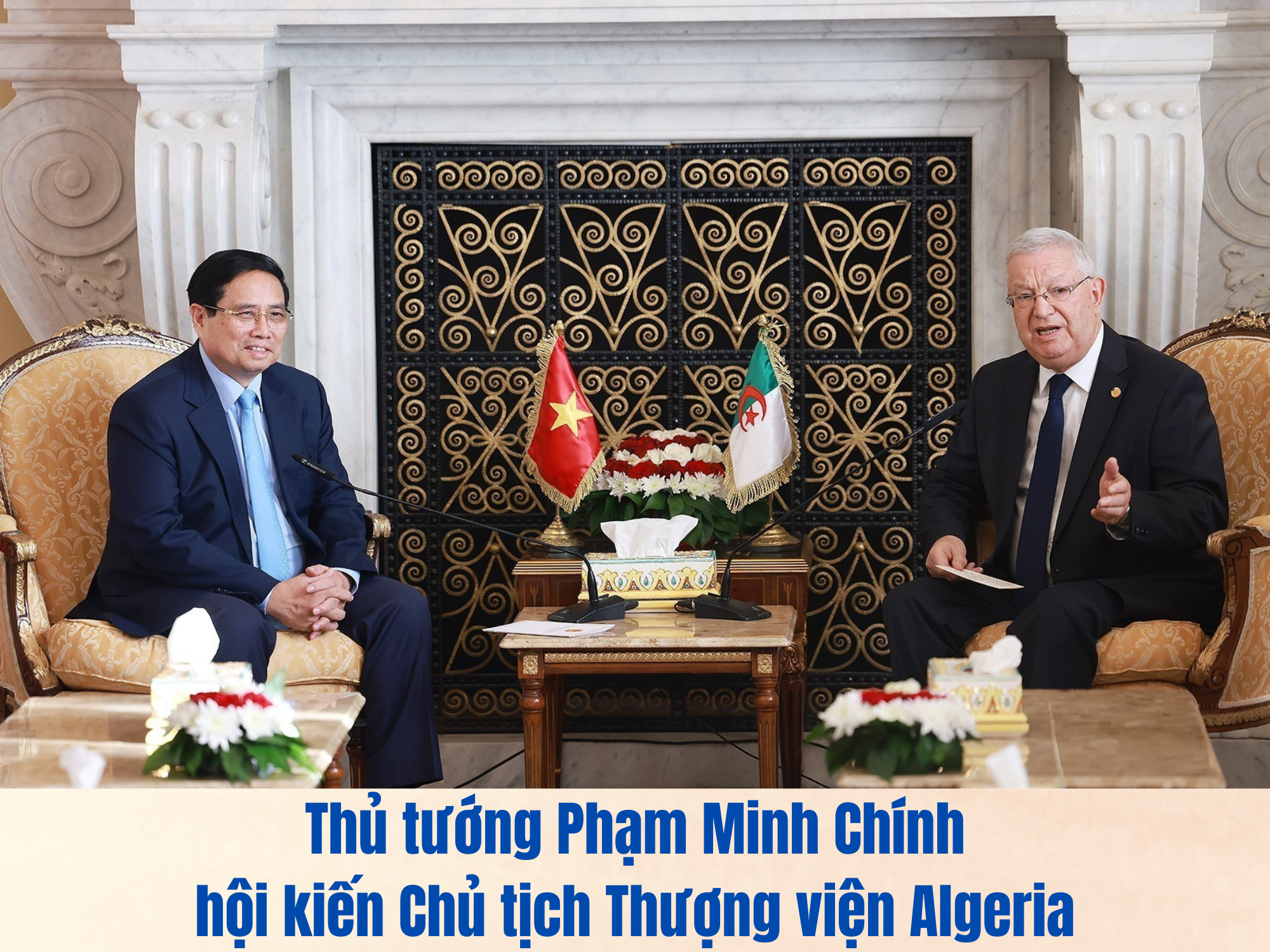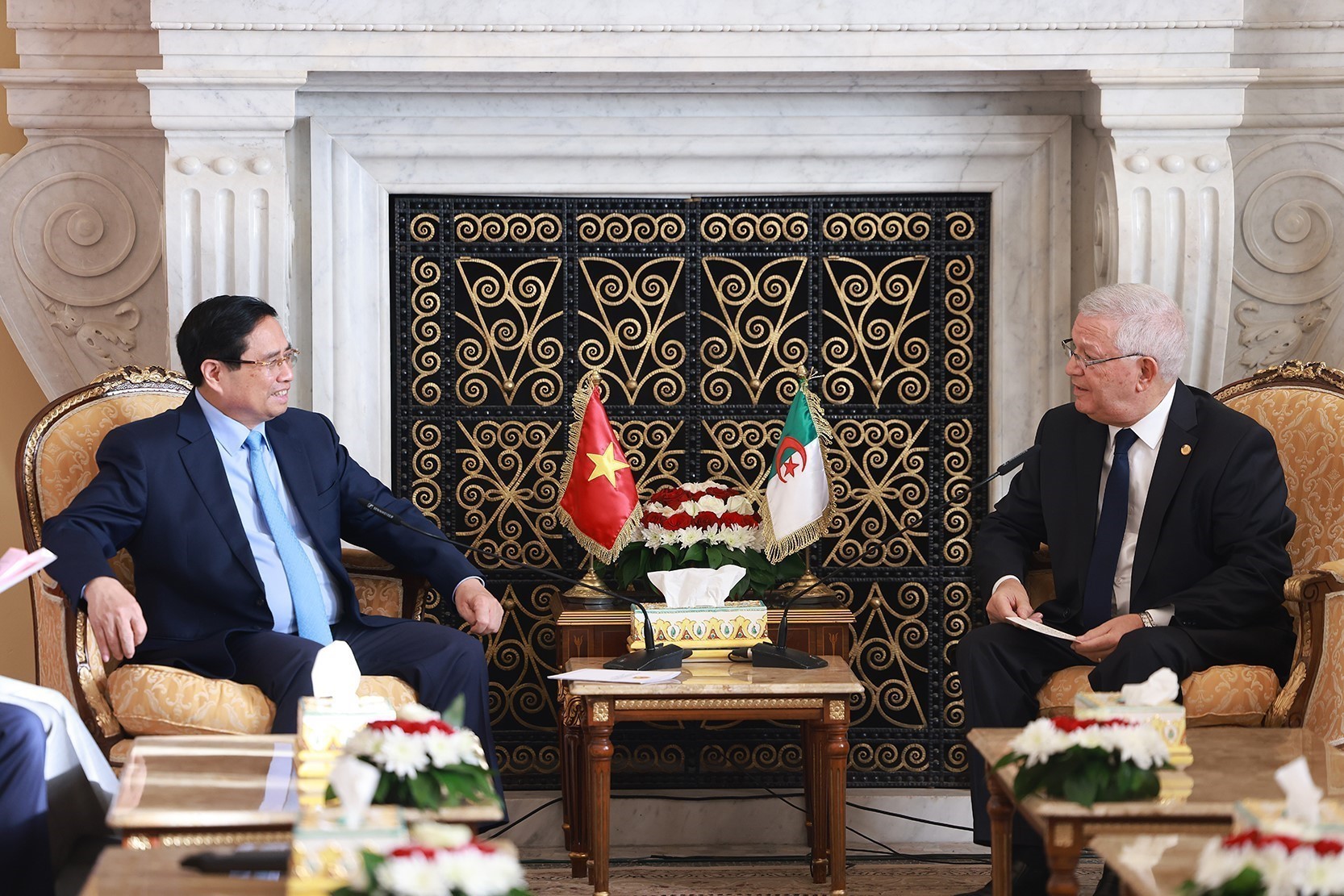 Sáng 20/11/2025 (giờ địa phương), tại thủ đô Alger, Thủ tướng Phạm Minh Chính hội kiến Chủ tịch Hội đồng Dân tộc Algeria (Thượng viện Algeria) Azzouz Nasri.
