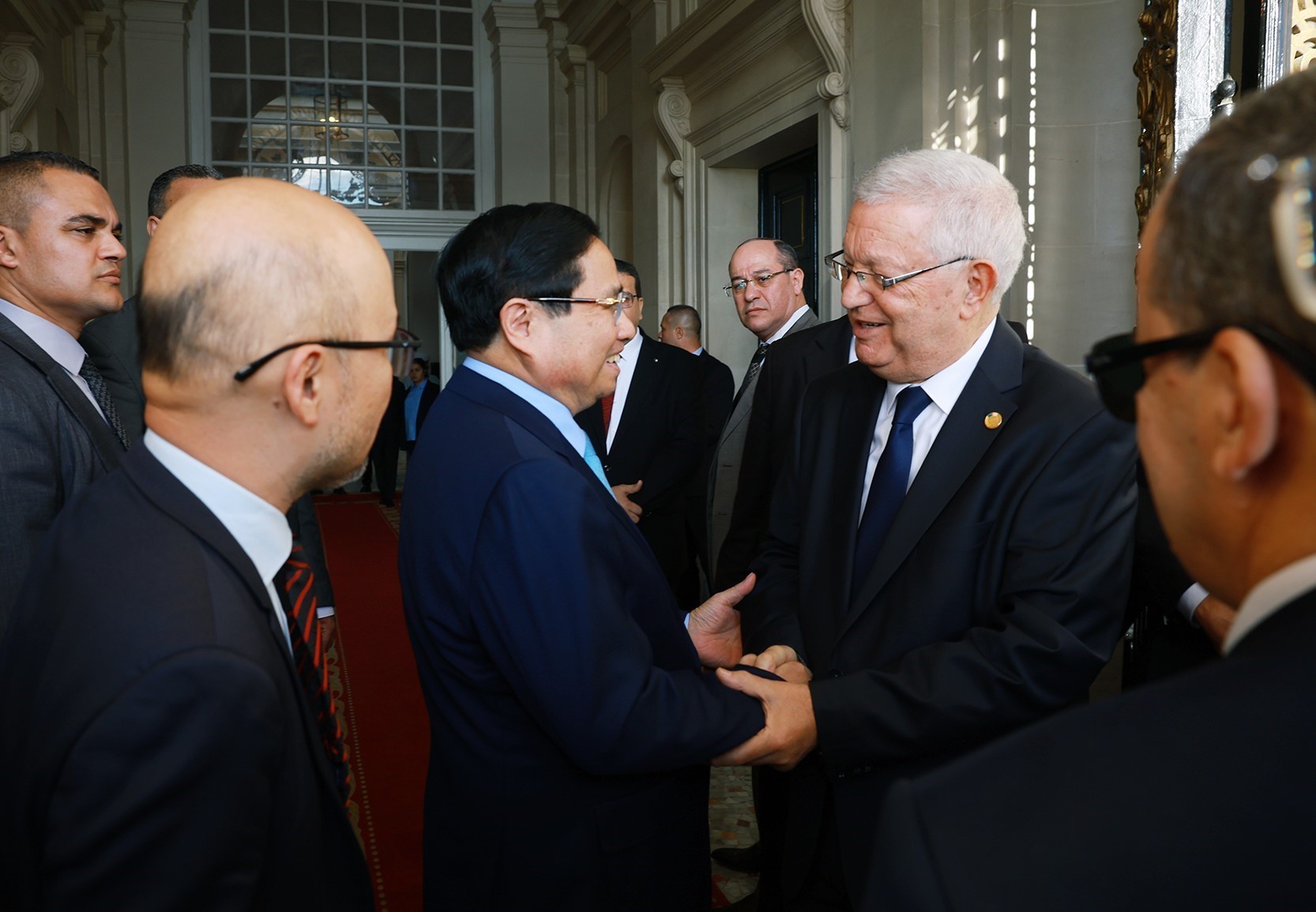 Thủ tướng Phạm Minh Chính hội kiến Chủ tịch Hội đồng Dân tộc Algeria (Thượng viện Algeria) Azzouz Nasri. Ảnh: Dương Giang-TTXVN