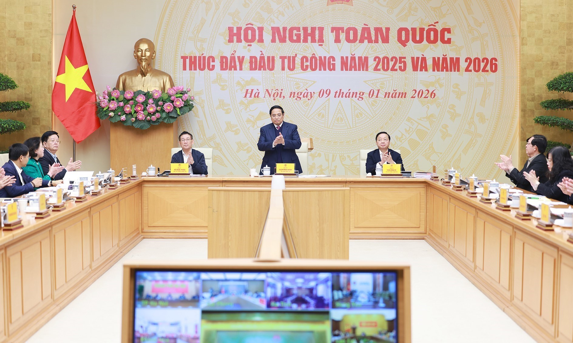 Chiều 9/1, Thủ tướng Chính phủ Phạm Minh Chính chủ trì Hội nghị toàn quốc thúc đẩy đầu tư công năm 2025 và năm 2026. Hội nghị được tổ chức trực tiếp tại Trụ sở Chính phủ, trực tuyến với 34 tỉnh, thành phố.