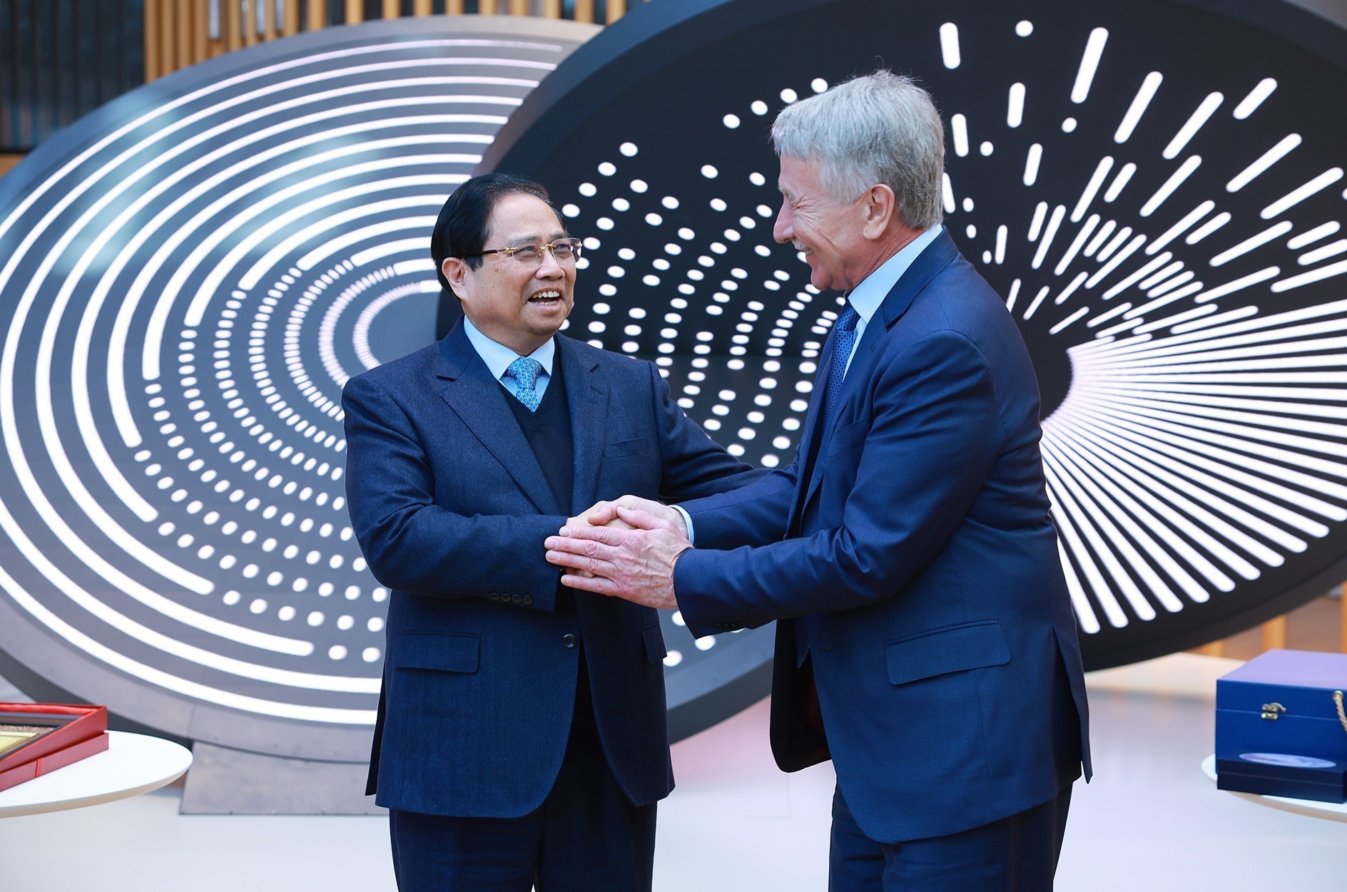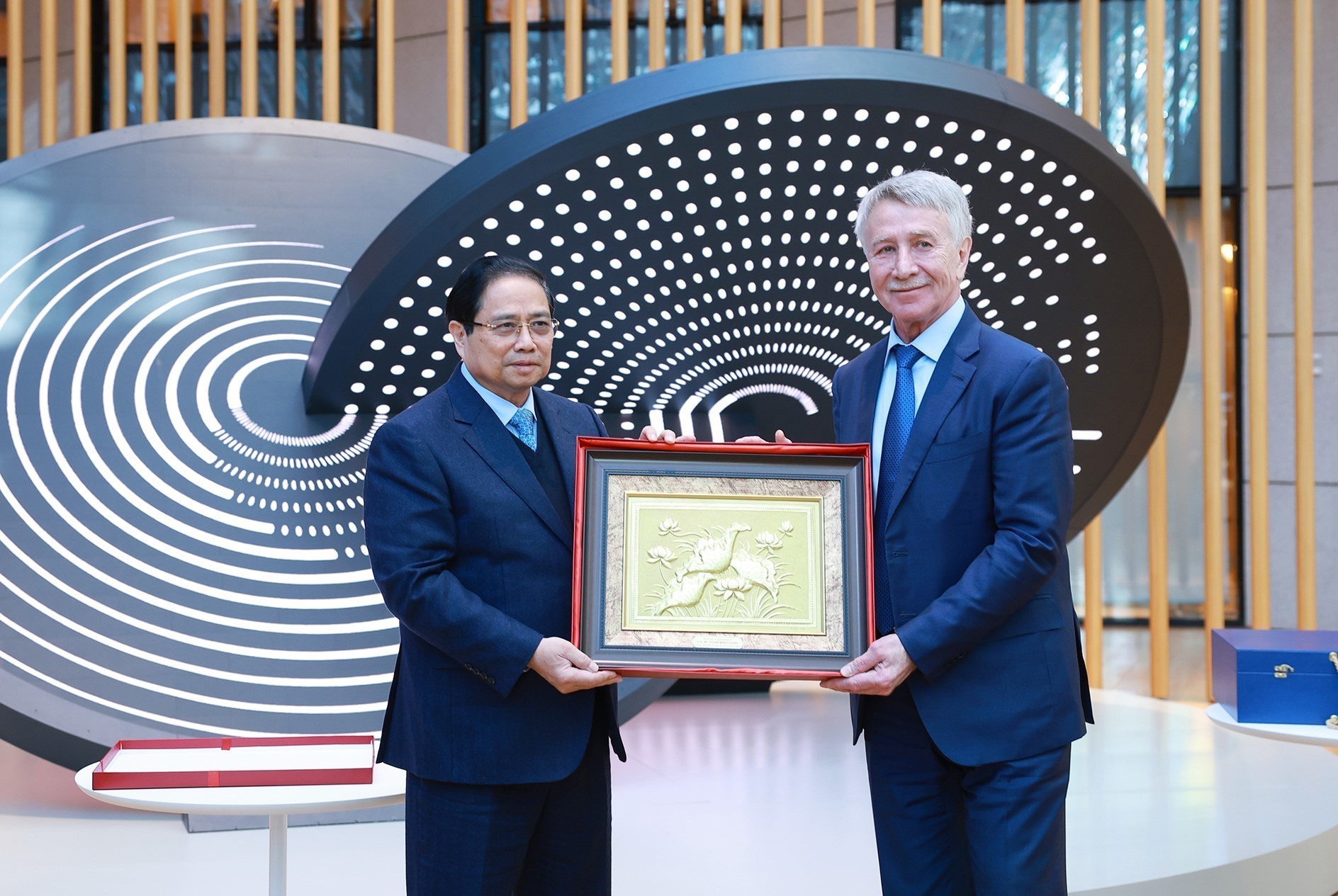 Thủ tướng Phạm Minh Chính tặng quà cho lãnh đạo Tập đoàn Novatek. Ảnh: Dương Giang-TTXVN