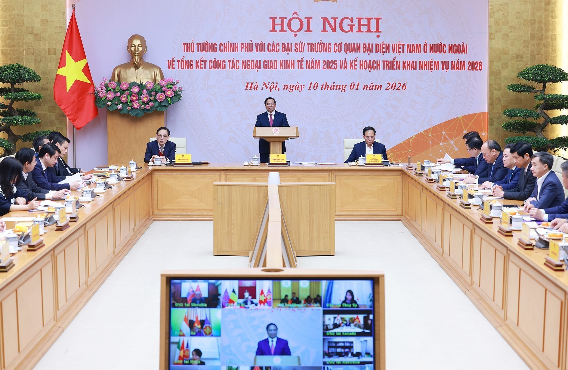 Tối 10/1, Thủ tướng Chính phủ Phạm Minh Chính chủ trì Hội nghị trực tuyến với các Đại sứ, Trưởng Cơ quan đại diện Việt Nam ở nước ngoài về tổng kết công tác ngoại giao kinh tế năm 2025 và triển khai nhiệm vụ năm 2026.