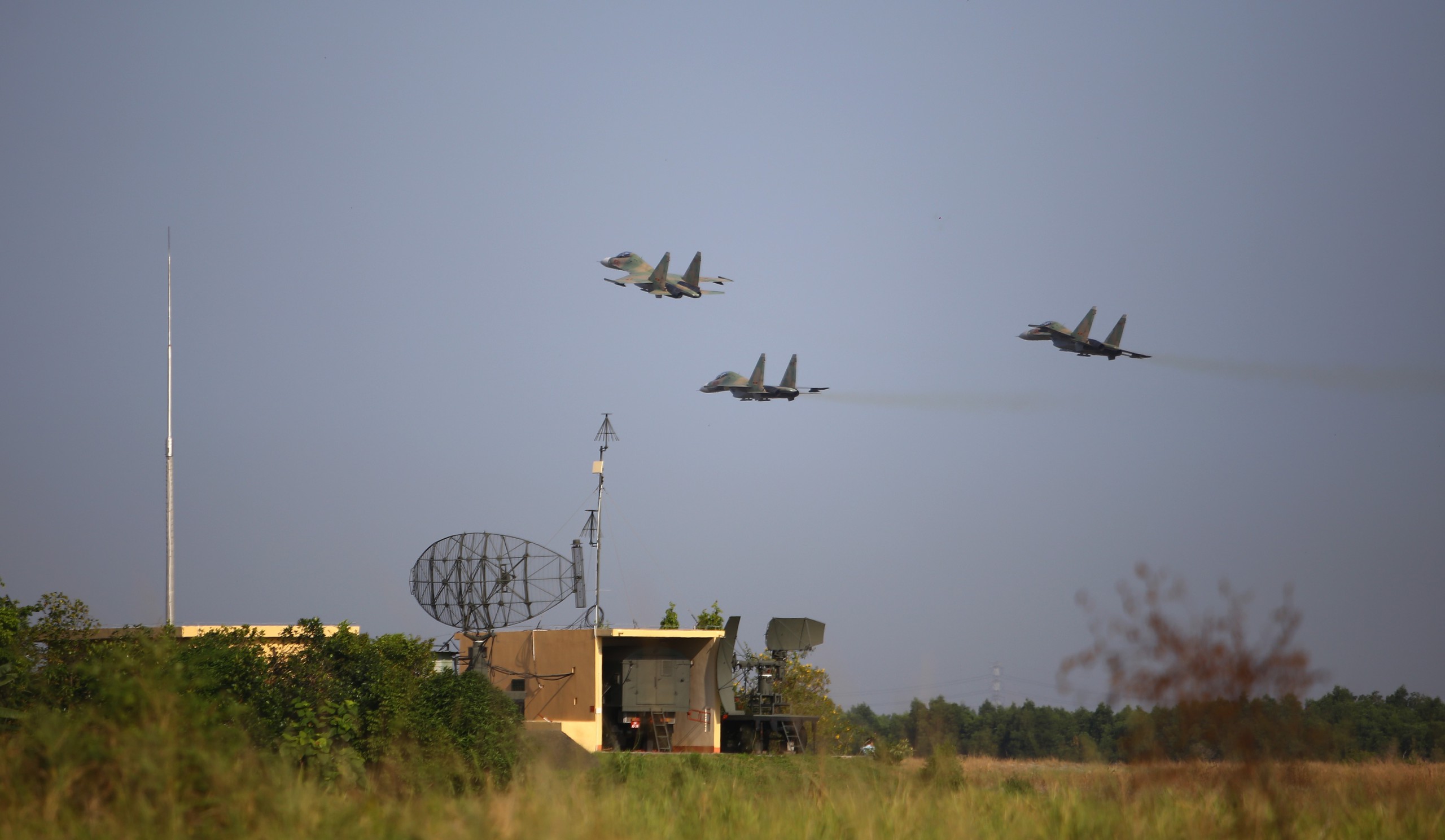 Hình ảnh Su-30MK2 thuộc Quân chủng Phòng không - Không quân diễn tập bay theo biên đội 3 chiếc quanh khán đài giả định để tập luyện cho lễ kỷ niệm Lễ Kỷ niệm 50 năm Giải phóng hoàn toàn miền Nam thống nhất đất nước. Ảnh: Lê Xuân - TTXVN