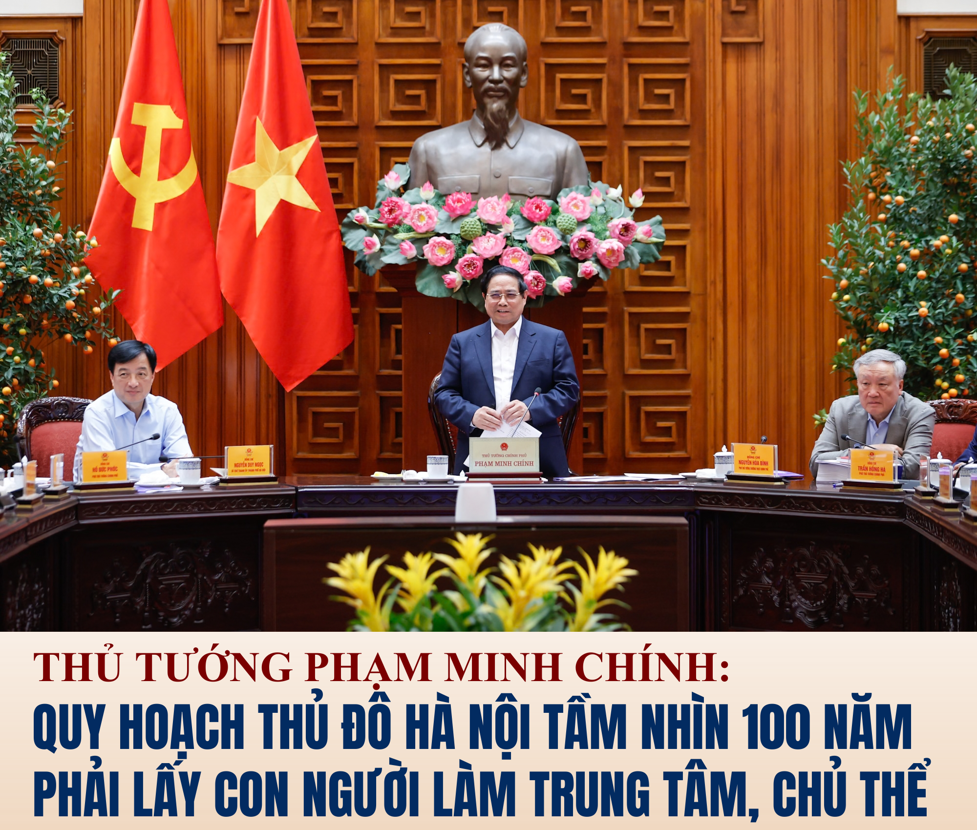 Nhấn mạnh thêm một số nội dung, Thủ tướng cho rằng, triết lý của Quy hoạch là lấy con người làm trung tâm, chủ thể; đô thị giàu mạnh, văn minh, phồn vinh, bản sắc, hiện đại và tầm nhìn 100 năm, phát triển đa cực, đa tầng, đa lớp, đa trung tâm, đa hướng, đa chiều, phát triển số, sáng, xanh, sạch, đẹp, văn hiến; hài hòa con người, văn hóa, xã hội, thiên nhiên, “làng trong phố, phố trong làng”, có bảo tồn, kế thừa và phát triển. Các đột phá là tái thiết đô thị, hiện đại hóa nông thôn, thông minh hóa dịch vụ, công nghiệp phải tiên tiến.