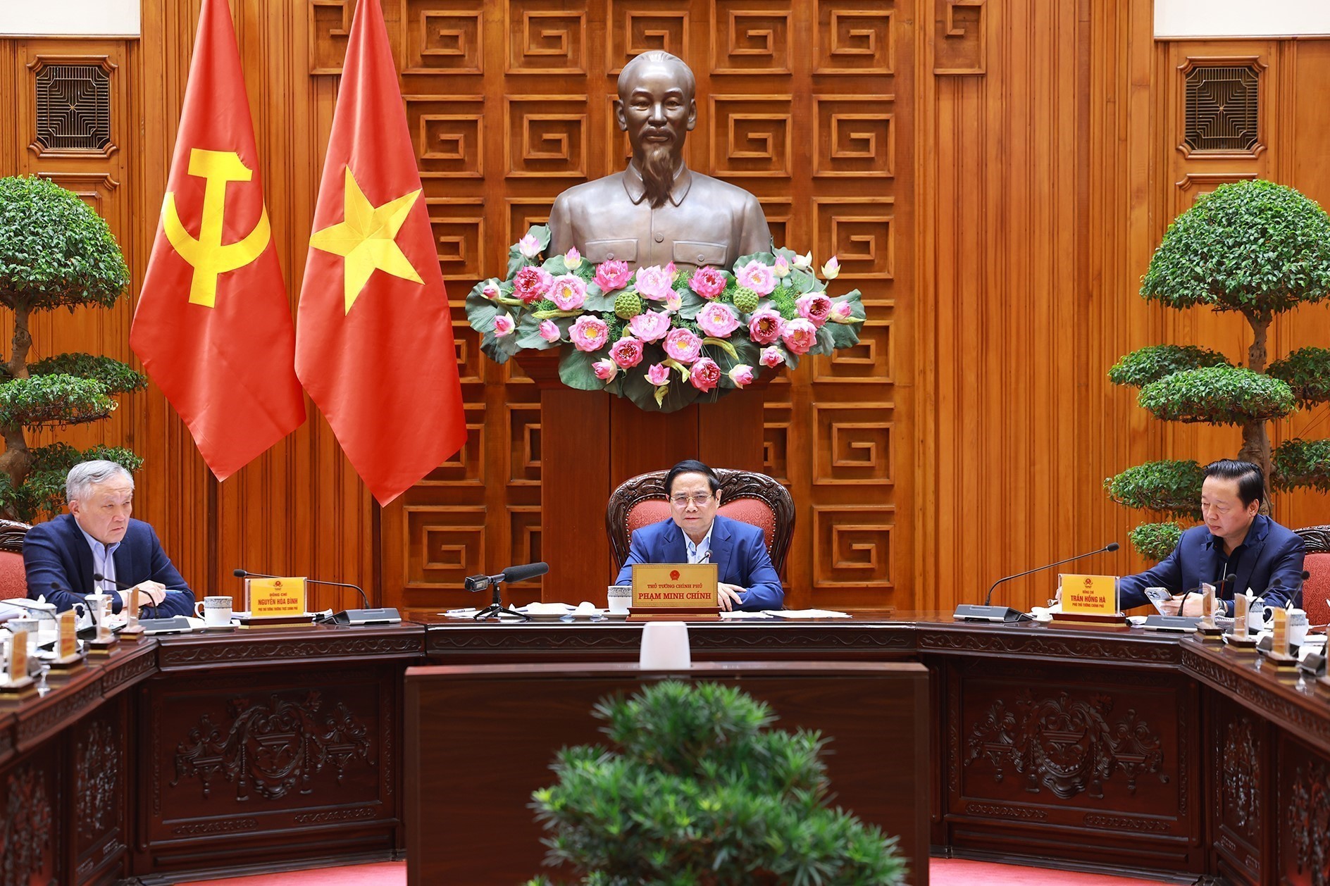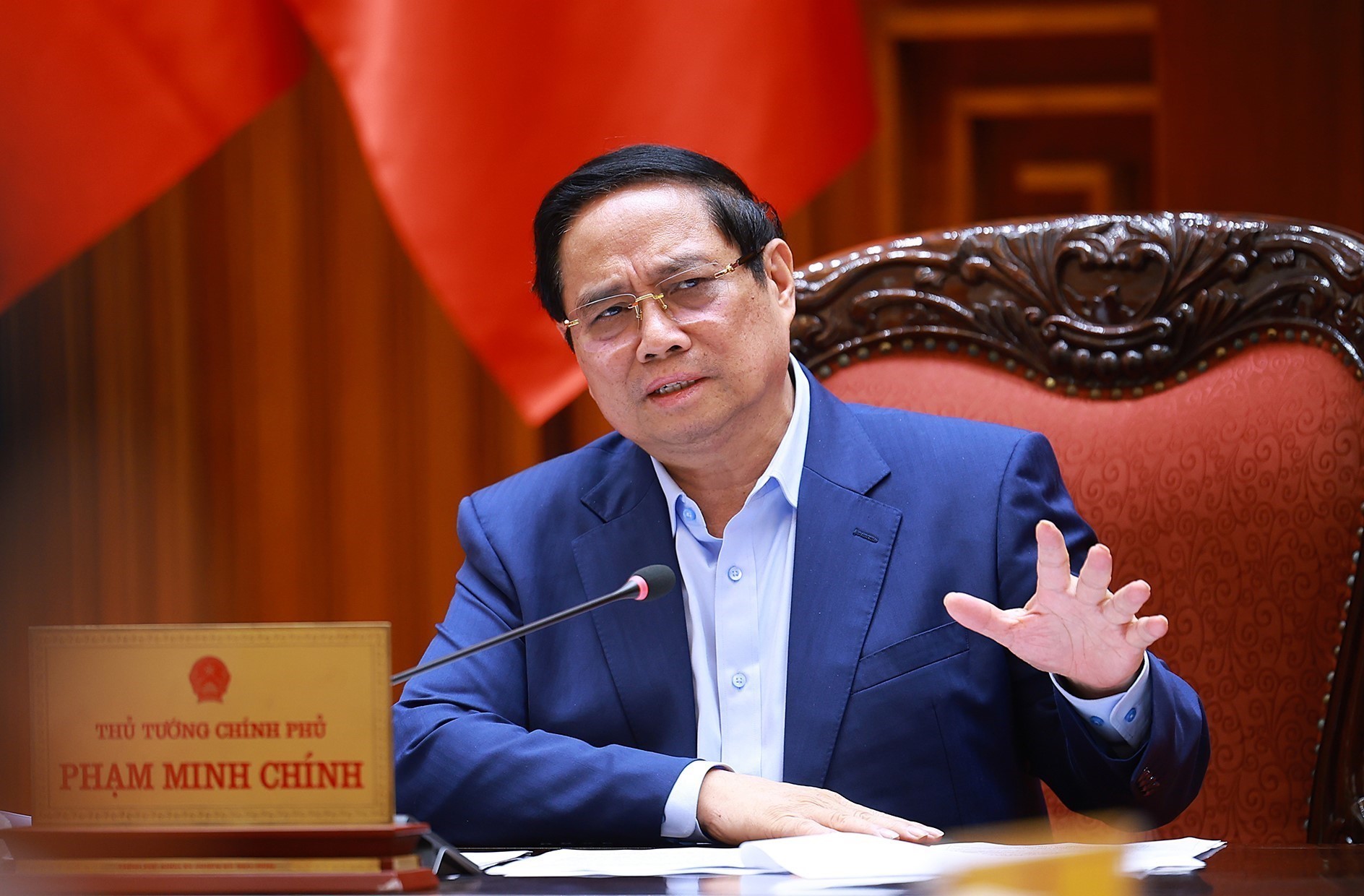 Thủ tướng Phạm Minh Chính chủ trì họp về Đề án phòng, chống sụt lún, sạt lở, ngập úng, hạn hán, xâm nhập mặn vùng đồng bằng sông Cửu Long đến năm 2035, tầm nhìn đến năm 2050. Ảnh: Dương Giang-TTXVN