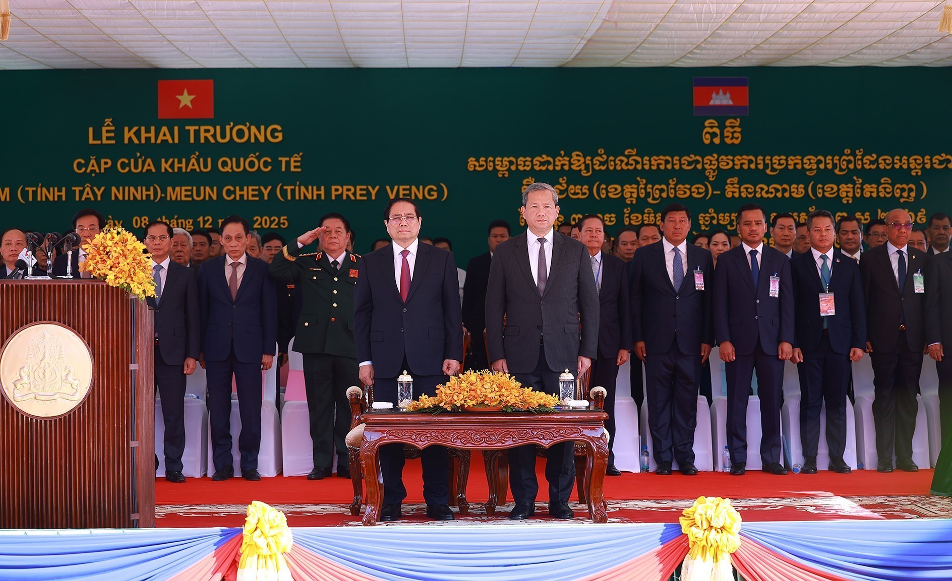 Sáng 8/12/2025, tại Tây Ninh, Thủ tướng Phạm Minh Chính và Thủ tướng Campuchia Hun Manet tham dự Lễ khai trương Cặp cửa khẩu quốc tế Tân Nam (tỉnh Tây Ninh) - Meun Chey (tỉnh Prey Veng).