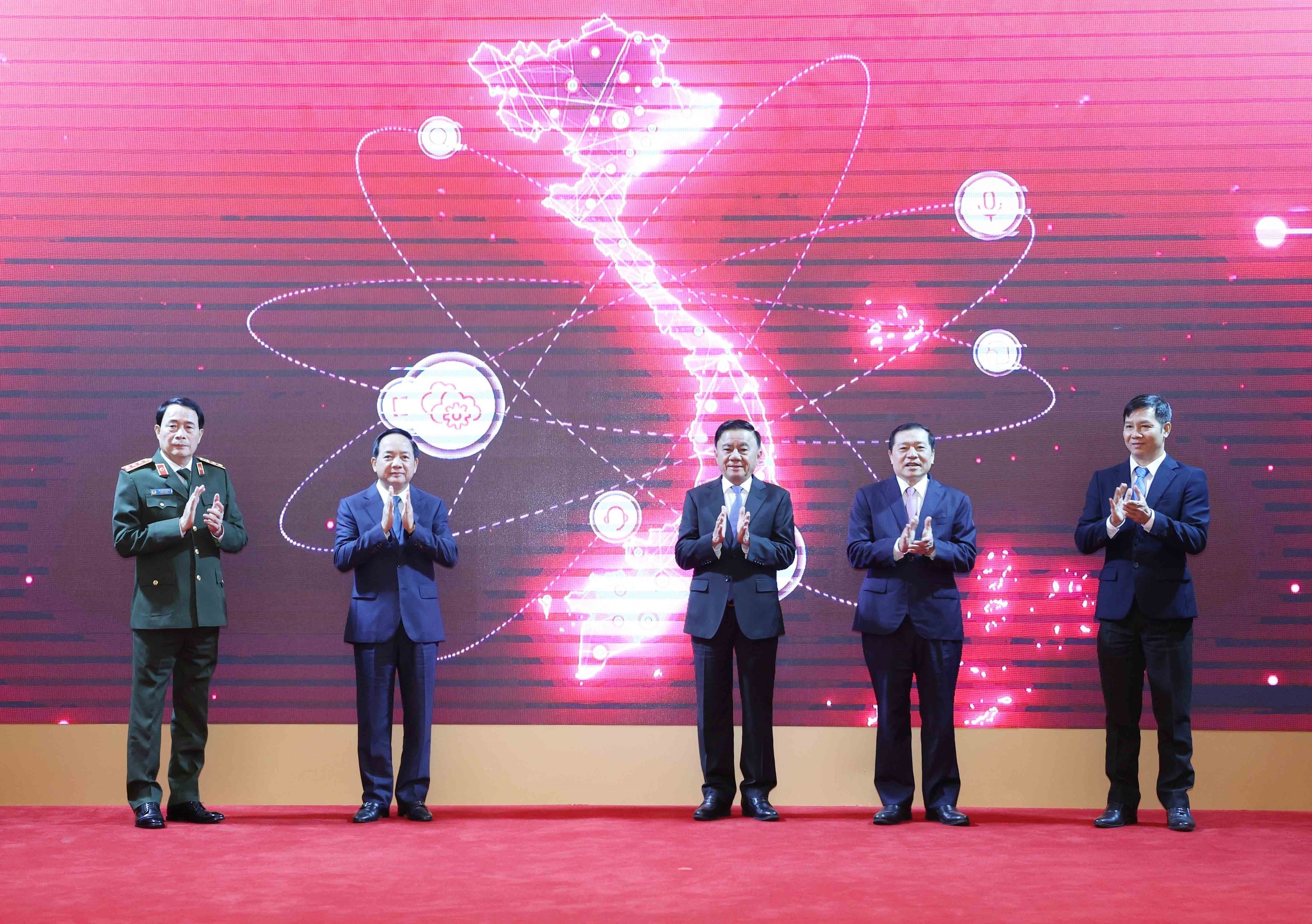 Thường trực Ban Bí thư Trần Cẩm Tú cùng các đại biểu nhấn nút khai trương ứng dụng của ngành Tuyên giáo và Dân vận trên điện thoại di động. Ảnh: Phương Hoa - TTXVN