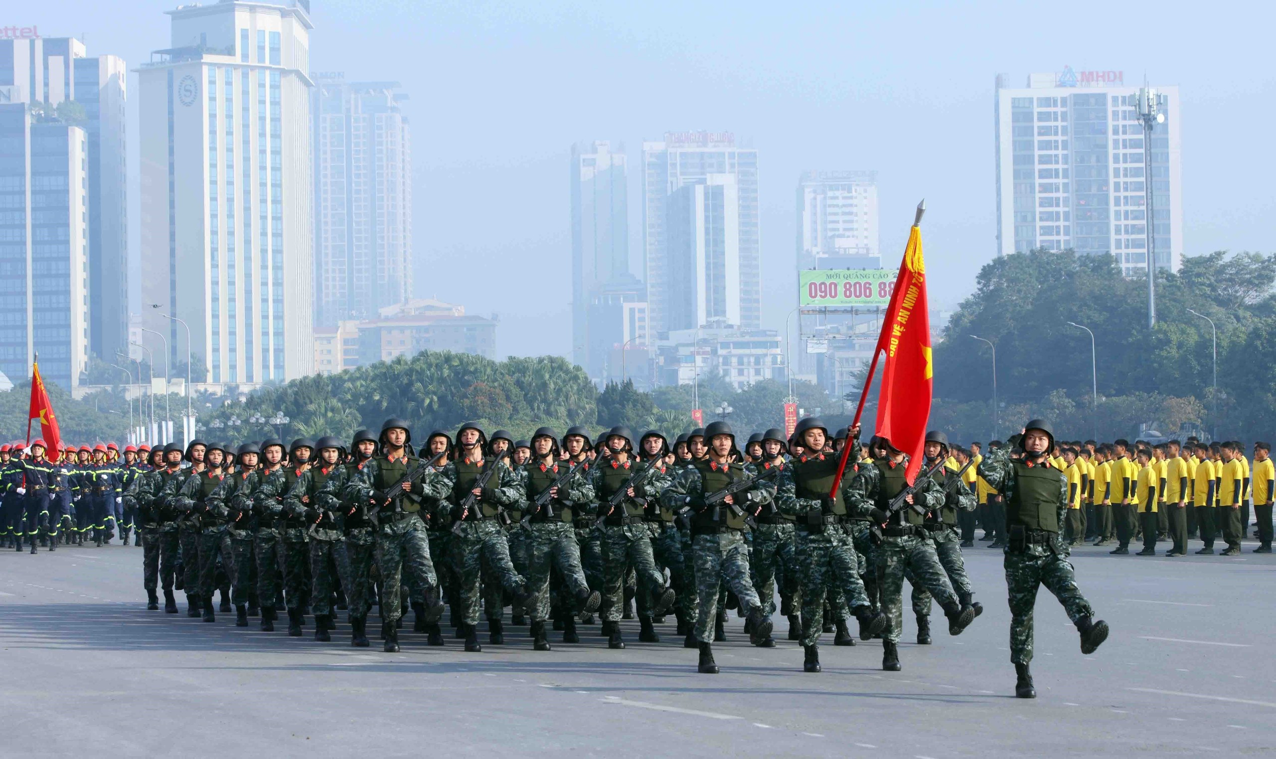 Tham gia lễ xuất quân, diễn tập có khoảng 5.000 cán bộ, chiến sĩ Công an nhân dân, đại diện cho lực lượng trực tiếp tham gia đảm bảo an ninh trật tự Đại hội XIV của Đảng.
