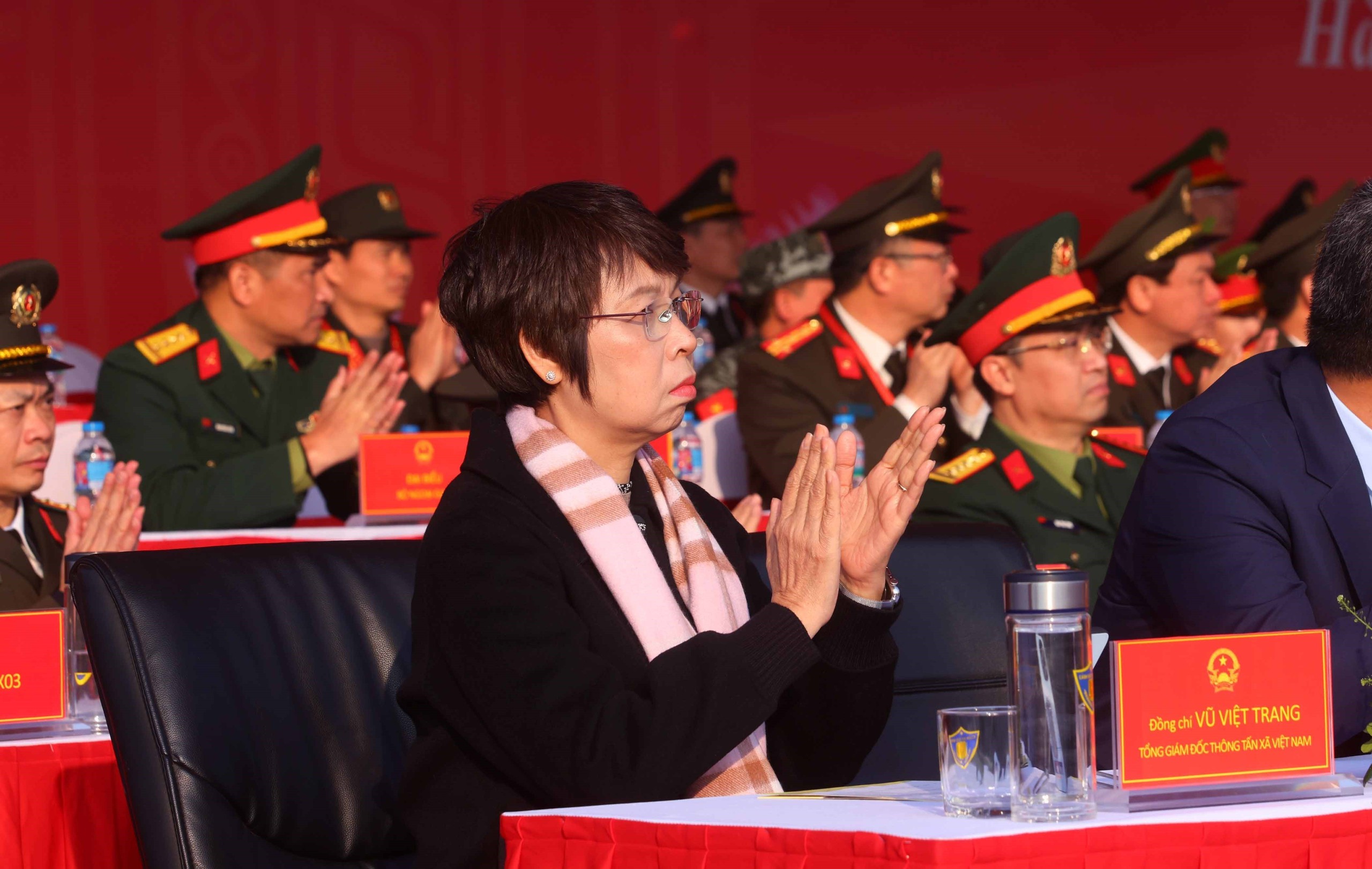 Thường trực Ban Bí thư Trần Cẩm Tú tặng hoa chúc mừng các lực lượng tham buổi lễ. Ảnh: Phạm Kiên - TTXVN