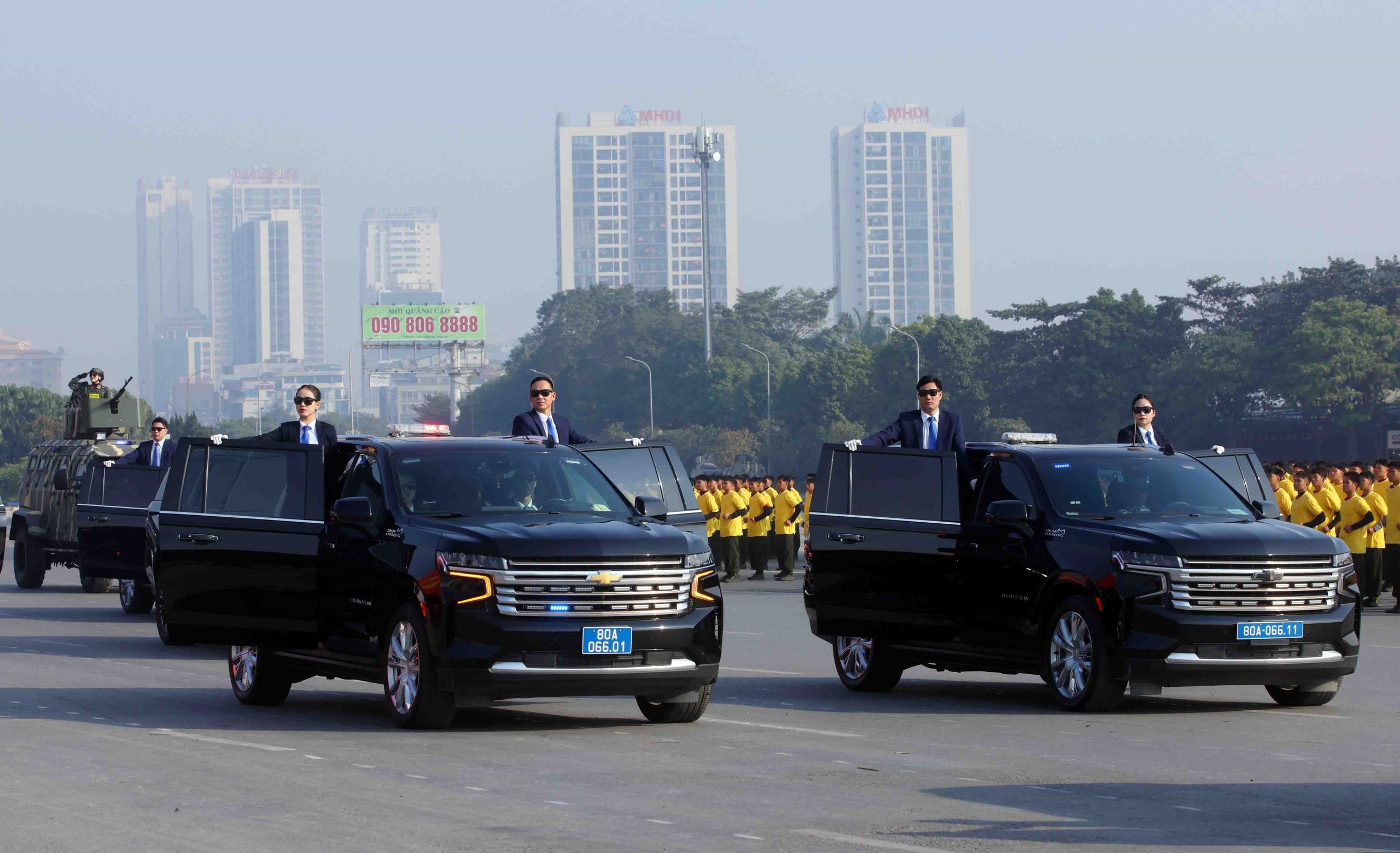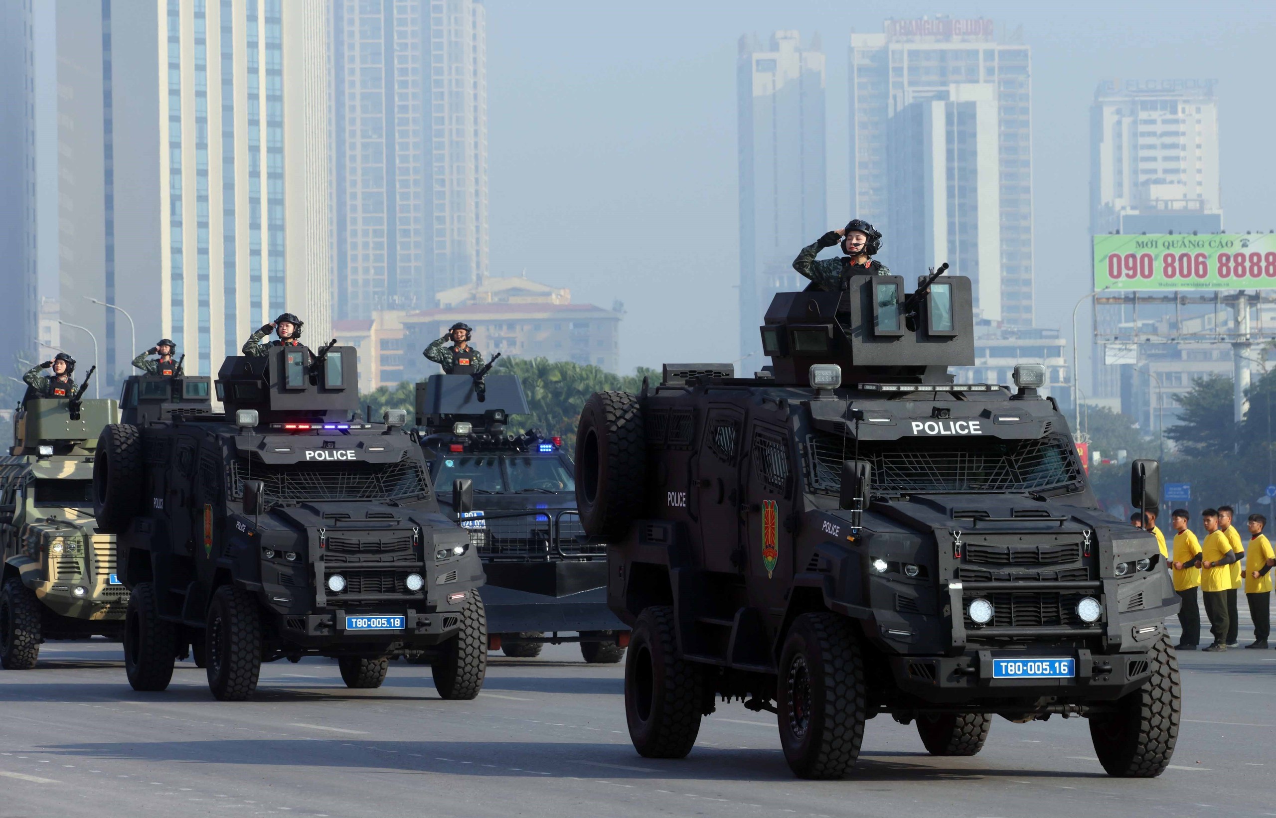 Khối xe bảo vệ, hộ tống Lãnh đạo Đảng, Nhà nước và đoàn khách quốc tế tham gia diễu hành phương tiện đặc chủng của Bộ Công an. Ảnh: Phạm Kiên - TTXVN