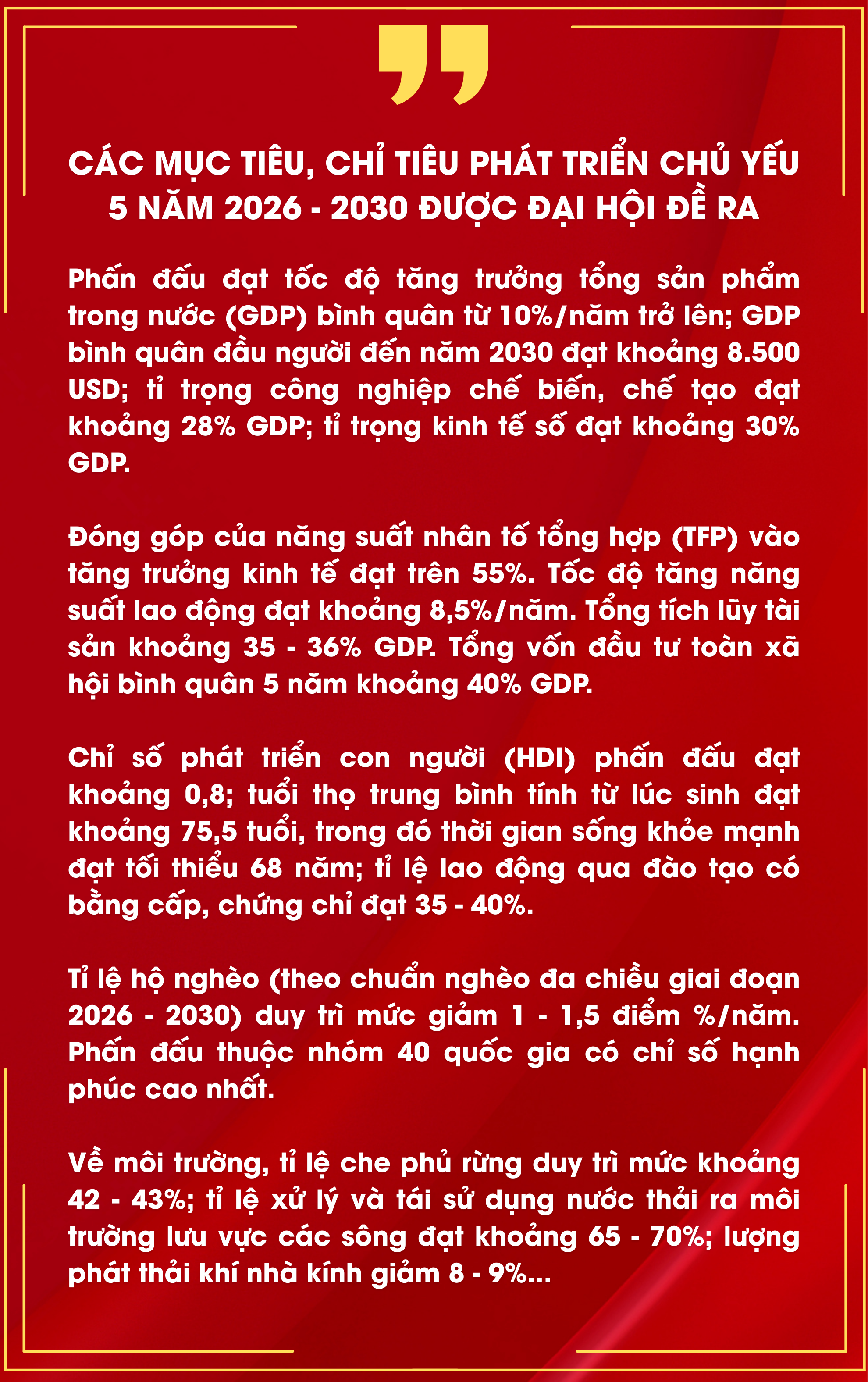 Đặc biệt, bài viết dành nhiều dung lượng nhấn mạnh ý nghĩa quyết định của giai đoạn 5-10 năm tới - khoảng thời gian bản lề đối với hai mục tiêu chiến lược 100 năm của đất nước. Mục tiêu đến năm 2030 trở thành quốc gia có công nghiệp hiện đại, thu nhập trung bình cao, và đến năm 2045 trở thành nước phát triển, thu nhập cao, được xác định rõ ràng, táo bạo nhưng không viển vông. Đó là những mục tiêu đòi hỏi tốc độ tăng trưởng cao liên tục, sự bứt phá mạnh mẽ về khoa học - công nghệ, đổi mới sáng tạo, cải cách thể chế và chất lượng nguồn nhân lực.