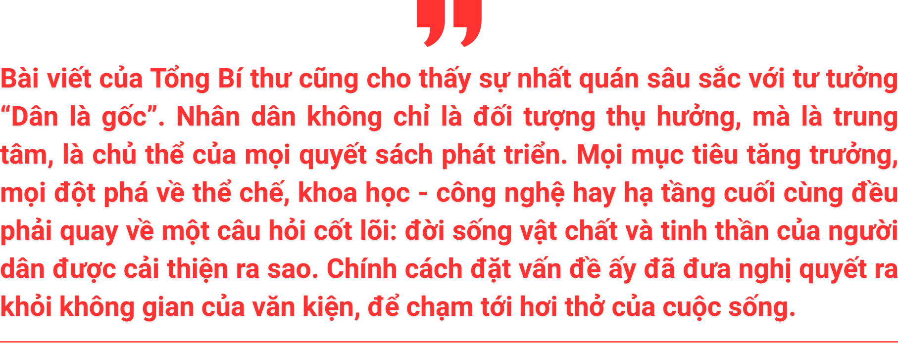 Điểm nổi bật của bài viết là tinh thần hành động xuyên suốt. Đại hội XIV không dừng ở việc xác lập tầm nhìn, mà lần đầu tiên ban hành Chương trình hành động kèm theo Nghị quyết - một bước đột phá thể hiện quyết tâm đưa chủ trương đi thẳng vào thực tiễn. Từ mục tiêu, lộ trình đến nguồn lực và trách nhiệm đều được xác định rõ ràng, minh bạch. Điều đó cho thấy một sự chuyển dịch quan trọng trong tư duy lãnh đạo và quản trị phát triển: không chỉ "đúng đường lối", mà phải "đúng việc", "đúng thời điểm" và "đến nơi đến chốn".