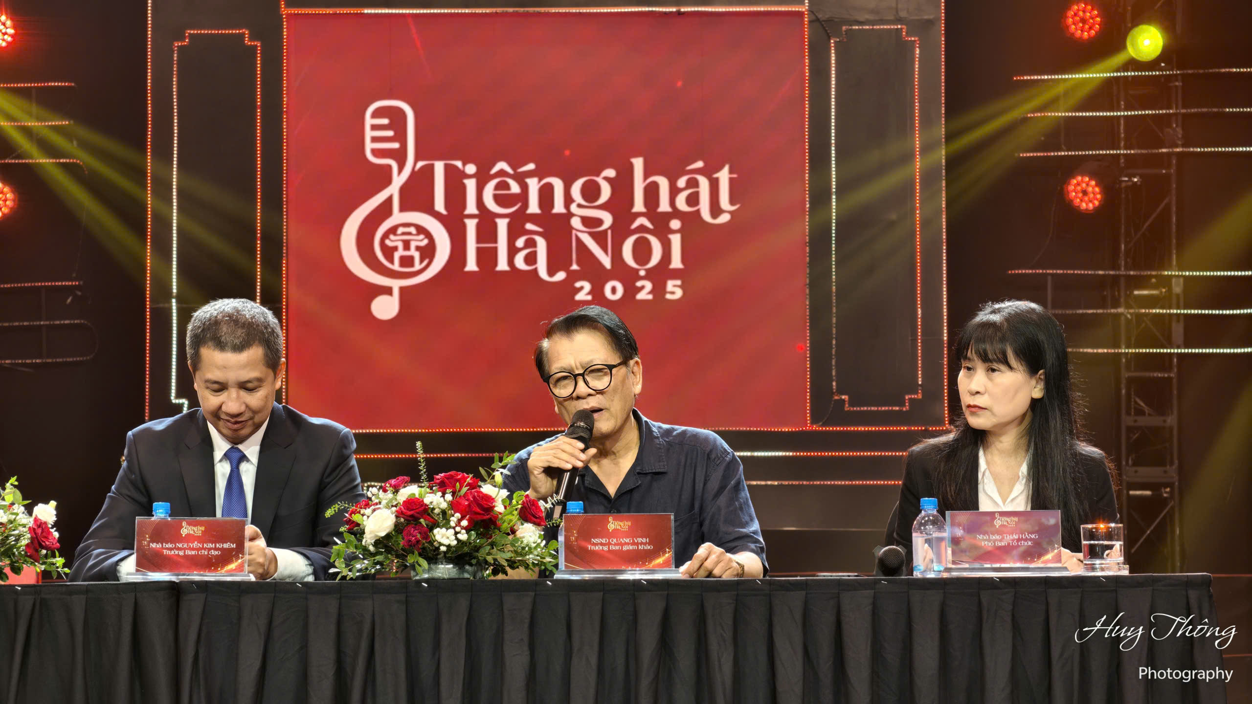 NSND Quang Vinh (Chủ tịch Hội Âm nhạc Hà Nội), giám khảo "Tiếng hát Hà Nội 2025" trả lời câu hỏi của báo chí