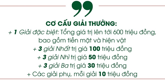 Một trong những điểm nhấn gây chú ý của mùa giải 2025 là cơ cấu giải thưởng được nâng tầm. Giải Đặc biệt có tổng giá trị lên tới 600 triệu đồng, bao gồm tiền mặt và xe VinFast VF5 Plus. Bên cạnh đó, cơ cấu giải còn có 3 giải Nhất (100 triệu đồng/giải), 3 giải Nhì (50 triệu đồng/giải), 3 giải Ba (30 triệu đồng/giải) và nhiều giải phụ (10 triệu đồng/giải). Sự đầu tư mạnh tay cho thấy quyết tâm của Ban tổ chức trong việc tạo bệ phóng thiết thực cho các tài năng trẻ.