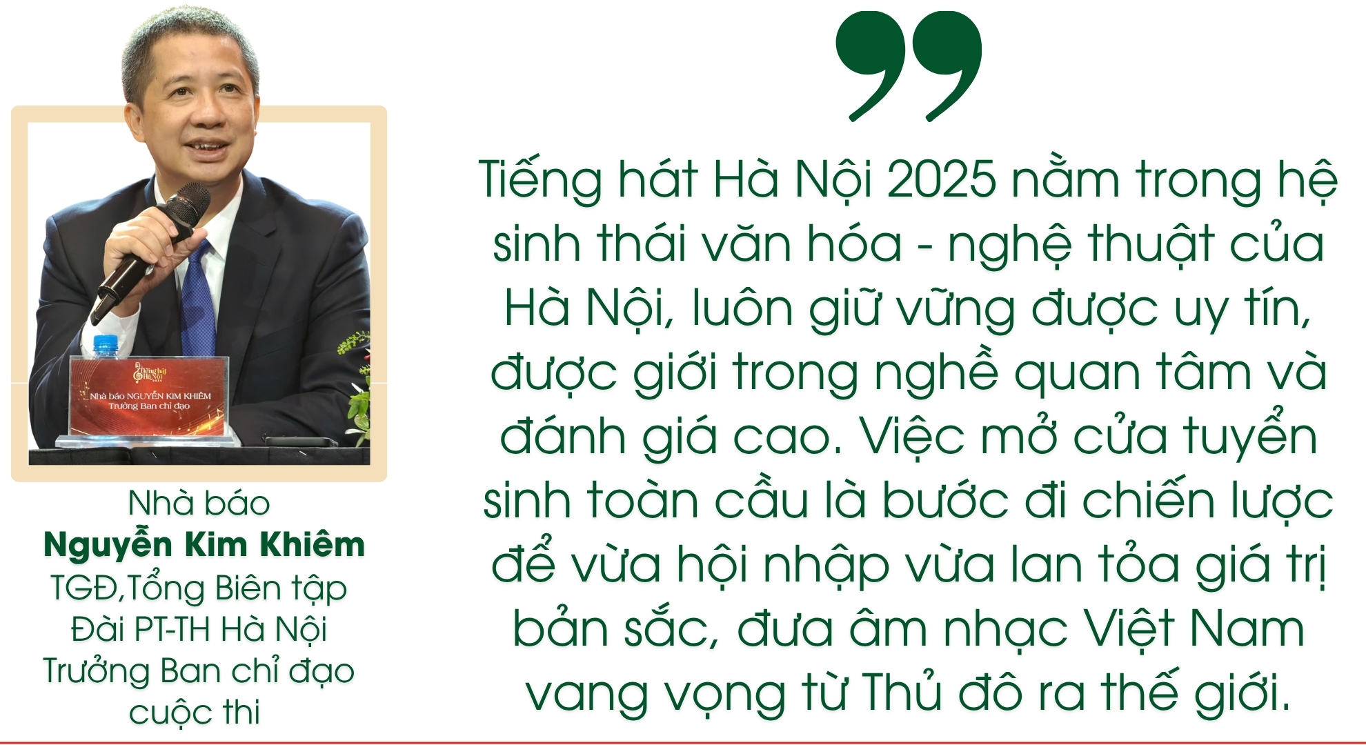 Chia sẻ về định hướng mùa giải năm nay, nhà báo Nguyễn Kim Kiêm - Tổng Giám đốc, Tổng Biên tập Đài PT-TH Hà Nội, Trưởng Ban chỉ đạo cuộc thi Tiếng hát Hà Nội 2025 nhấn mạnh: "Tiếng hát Hà Nội 2025 nằm trong hệ sinh thái văn hóa - nghệ thuật của Hà Nội, luôn giữ vững được uy tín, được giới trong nghề quan tâm và đánh giá cao." Theo lãnh đạo Đài, việc mở cửa tuyển sinh toàn cầu, song song với yêu cầu trình diễn bằng tiếng Việt, là bước đi chiến lược để vừa hội nhập vừa lan tỏa giá trị bản sắc, đưa âm nhạc Việt vang vọng từ Thủ đô ra thế giới.