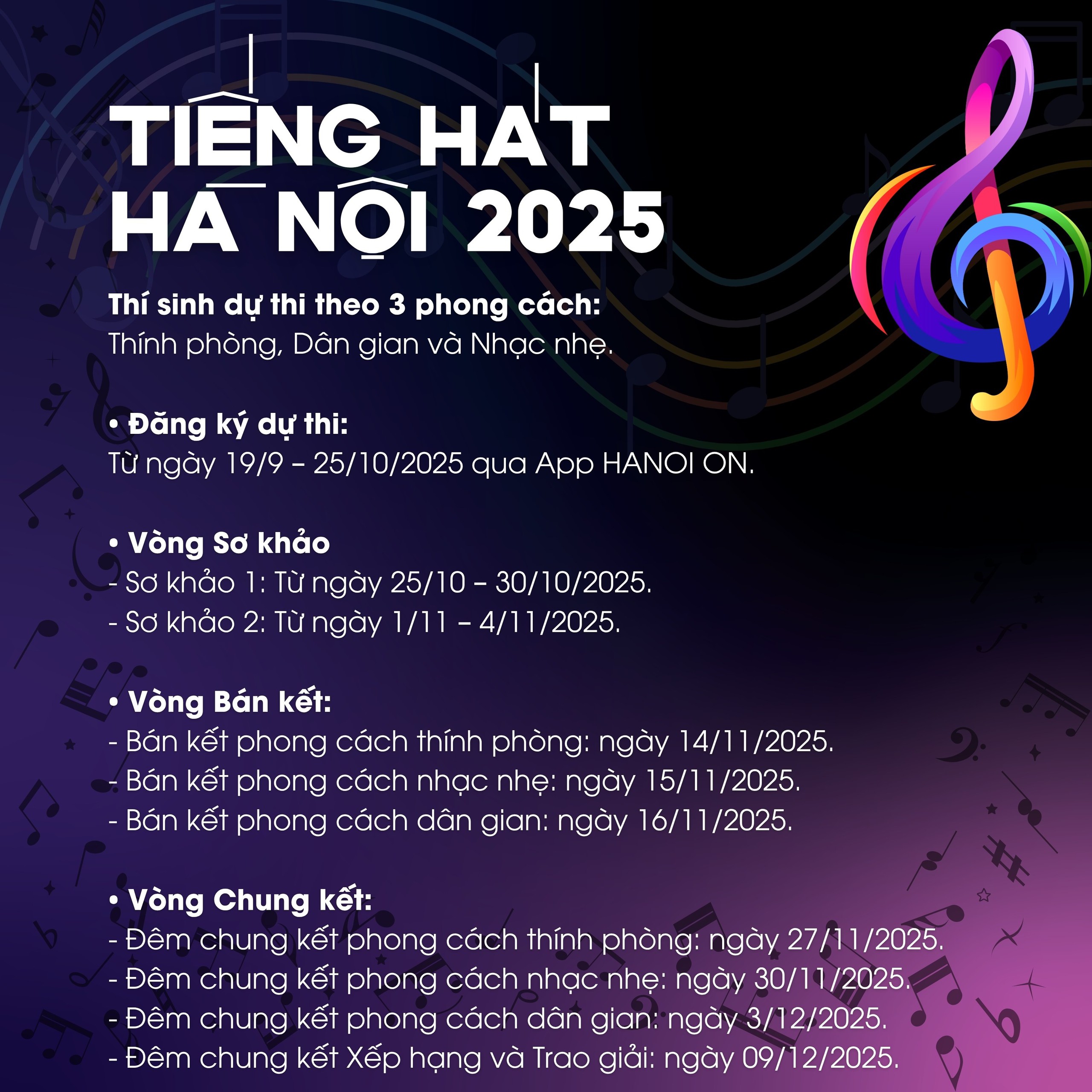 Cuộc thi năm nay có ba phong cách dự thi: Thính phòng – Dân gian – Nhạc nhẹ. Thí sinh đăng ký qua ứng dụng HANOI ON từ ngày 19/9 đến 25/10/2025. Vòng Sơ khảo diễn ra hai đợt (25/10–30/10 và 1/11–4/11). Vòng Bán kết tổ chức theo từng phong cách: Thính phòng (14/11), Nhạc nhẹ (15/11), Dân gian (16/11). Bốn đêm Chung kết lần lượt là Thính phòng (27/11), Nhạc nhẹ (30/11), Dân gian (3/12) và đêm Chung kết xếp hạng – trao giải (9/12/2025).