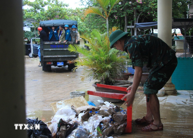 Lực lượng quân đội giúp đỡ vệ sinh và dọn dẹp sau đợt mưa lũ ở Khánh Hòa - Ảnh: TTXVN