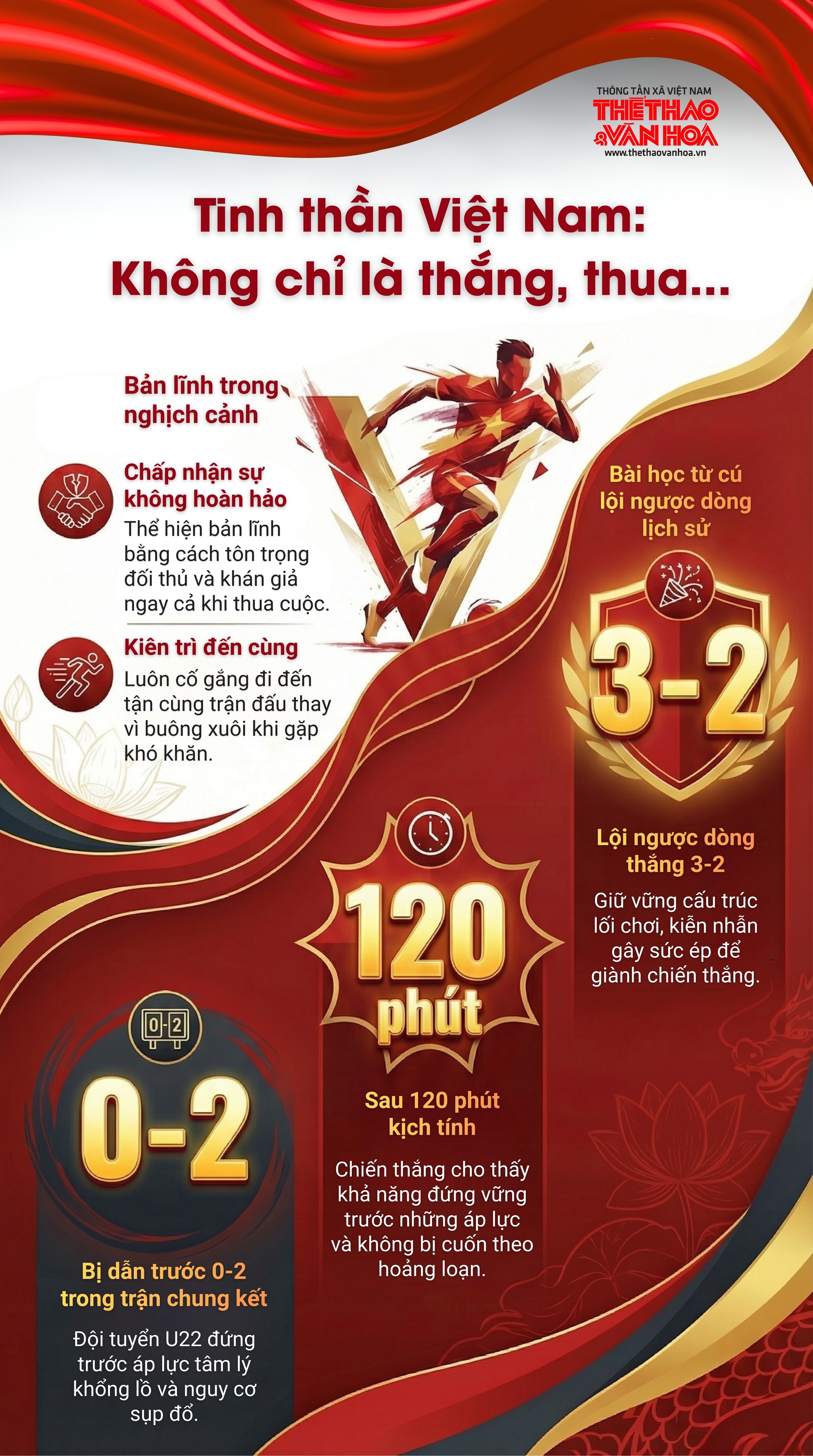 Thế nhưng, U22 Việt Nam không buông xuôi hay rối loạn. Các cầu thủ vẫn cố gắng giữ cấu trúc lối chơi, tiếp tục phối hợp, tìm khoảng trống và kiên nhẫn gây sức ép. Và rồi, họ lật ngược tình thế để giành chức vô địch.