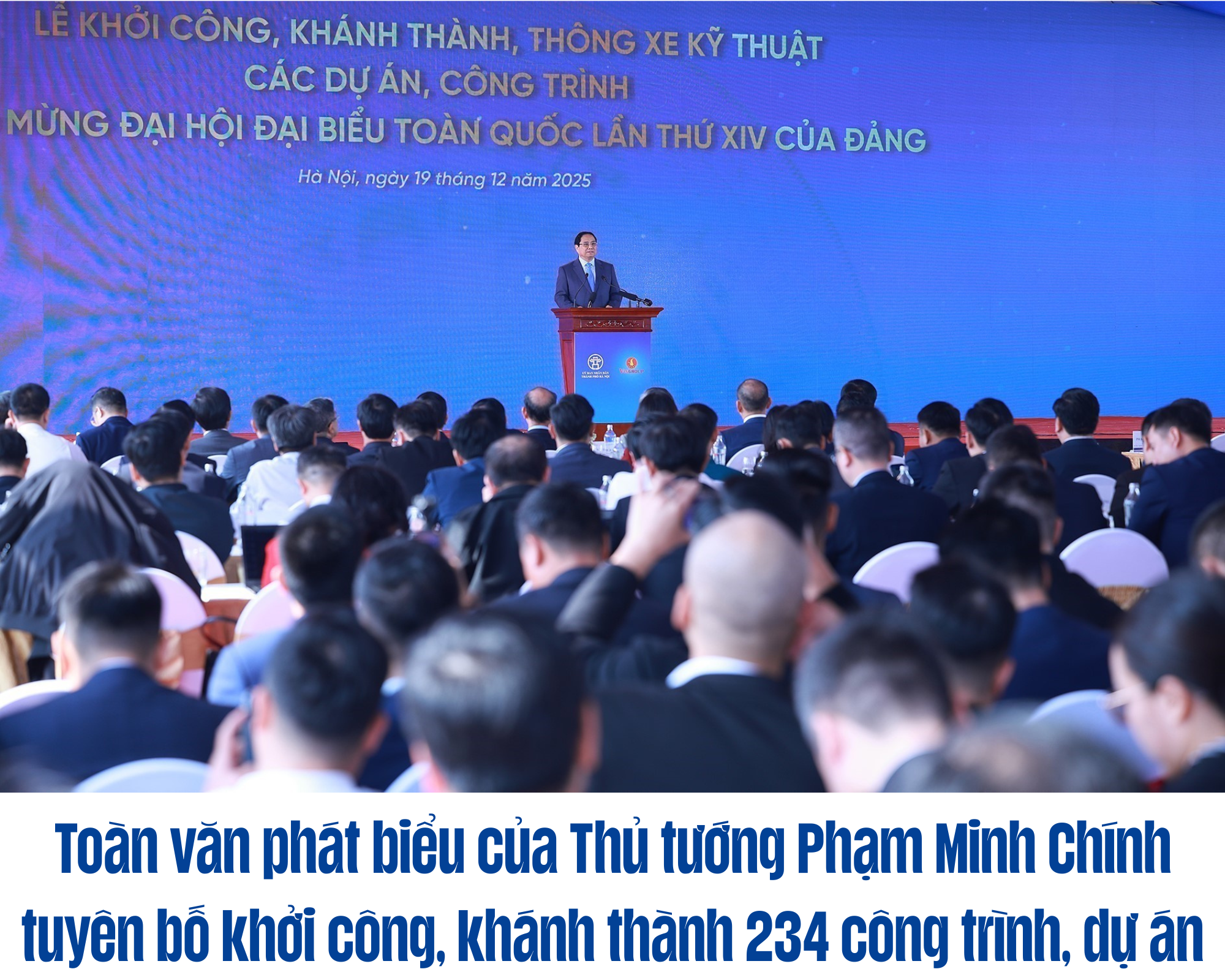 Với tinh thần "Đảng chỉ đạo, Nhà nước kiến tạo, Doanh nghiệp tiên phong, Công tư đồng hành, Đất nước phát triển, Nhân dân hạnh phúc", tôi chính thức tuyên bố khởi công, khánh thành, thông xe kỹ thuật 234 công trình, dự án chào mừng Đại hội đại biểu toàn quốc lần thứ XIV của Đảng và Đại hội thi đua yêu nước toàn quốc lần thứ XI (tổ chức vào ngày 26 và 27/12/2025).