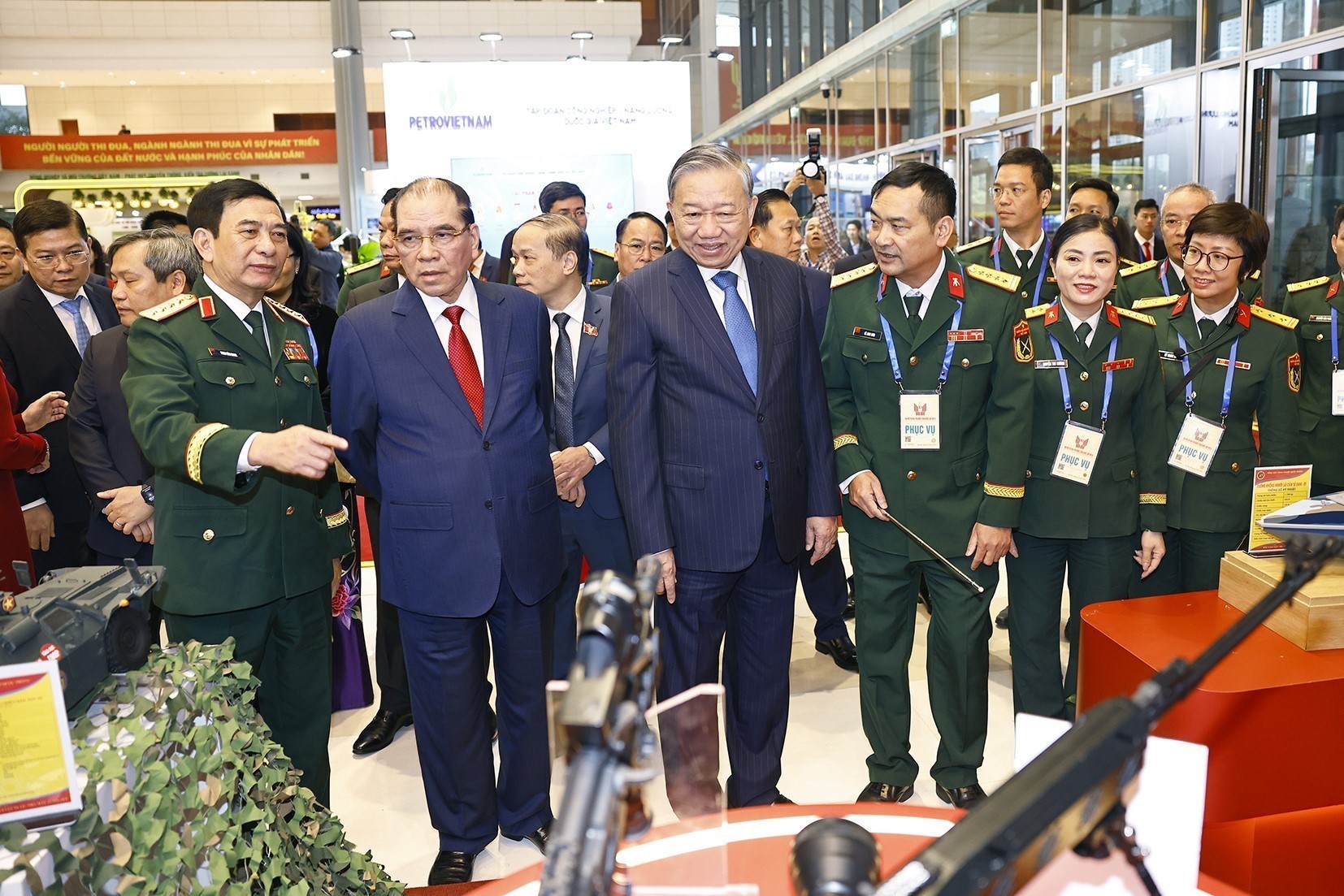 Tổng Bí thư Tô Lâm cùng các đồng chí lãnh đạo, nguyên lãnh đạo Đảng và Nhà nước tham quan các gian trưng bày tại Đại hội. Ảnh: Doãn Tấn - TTXVN