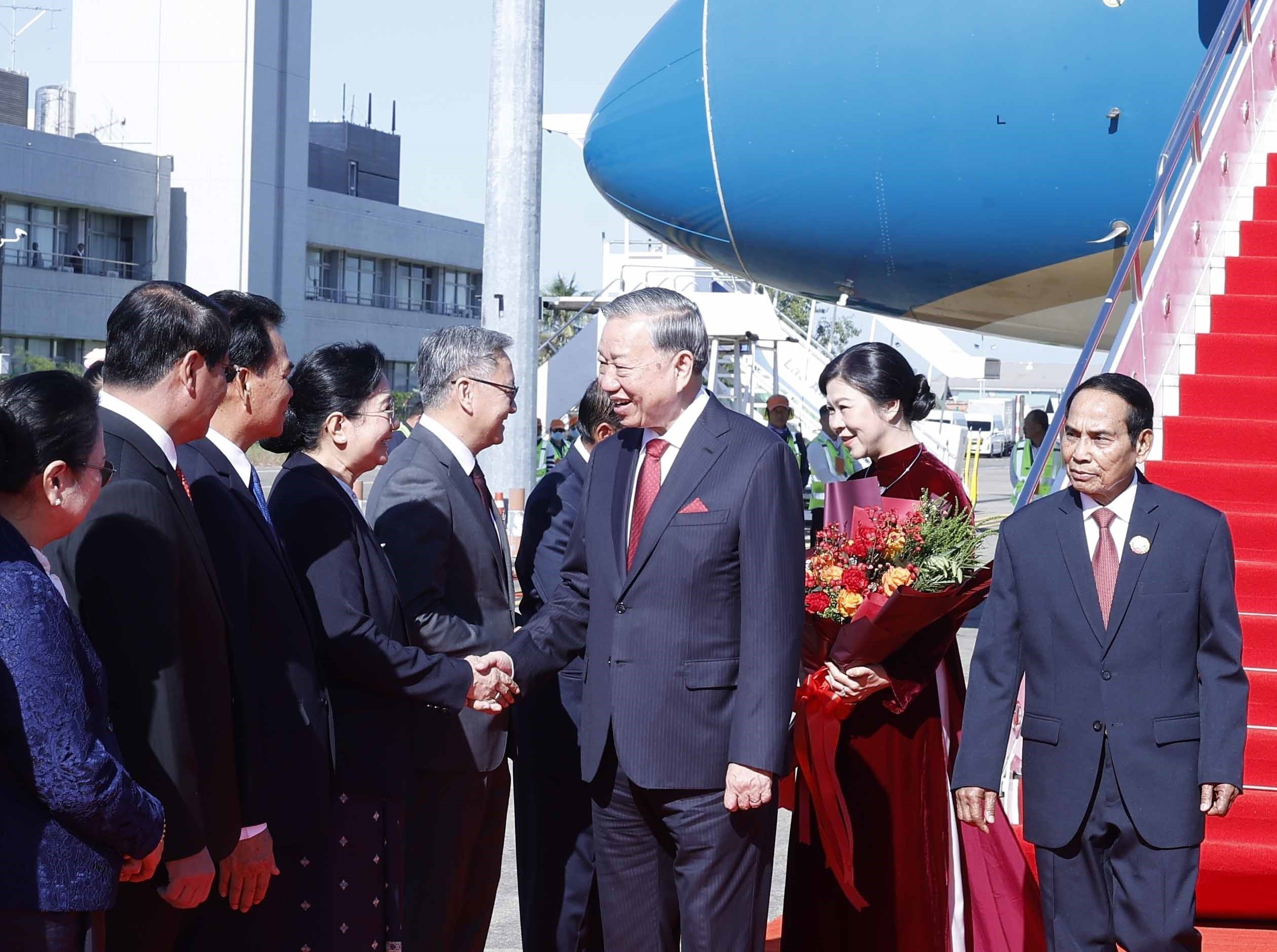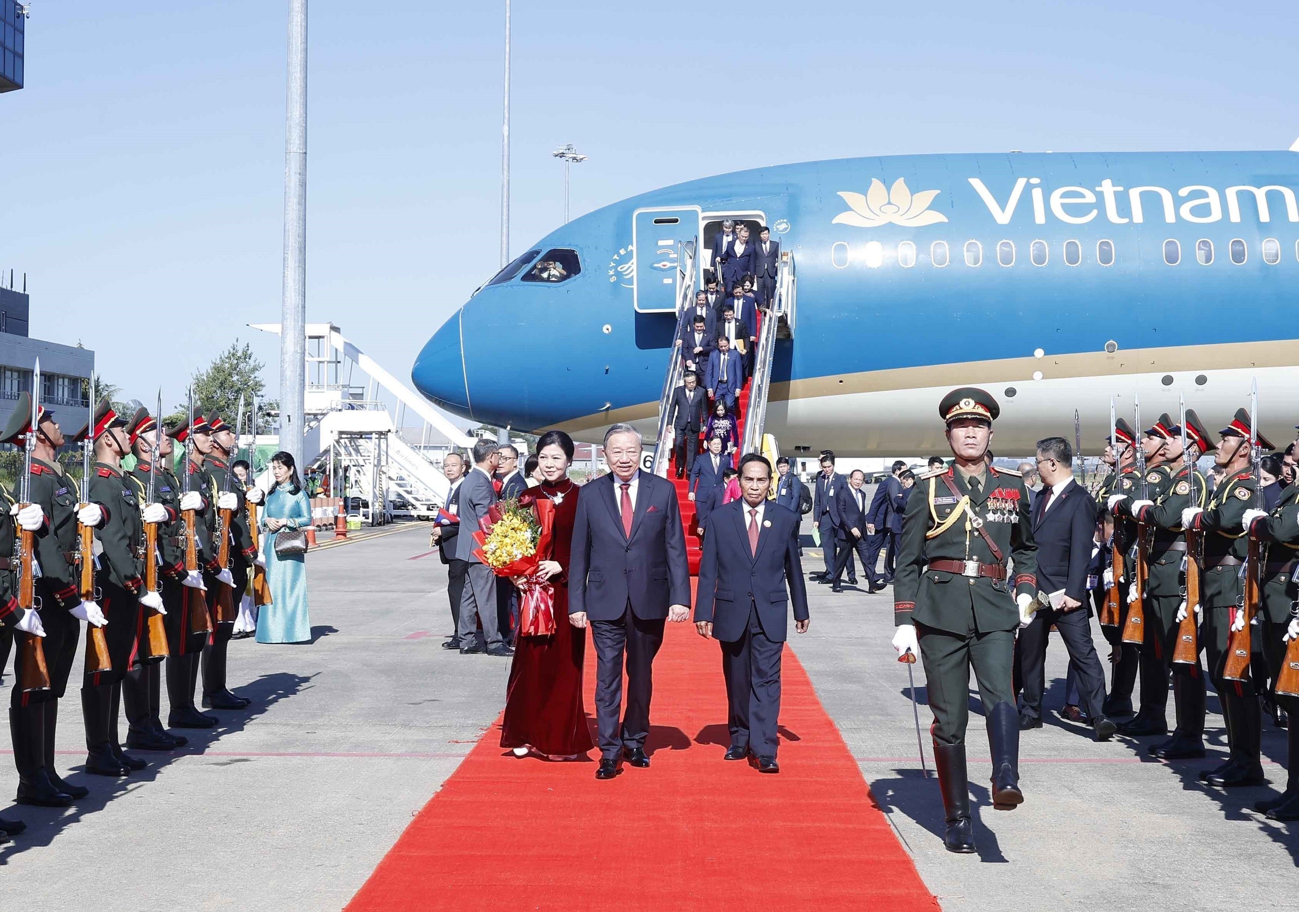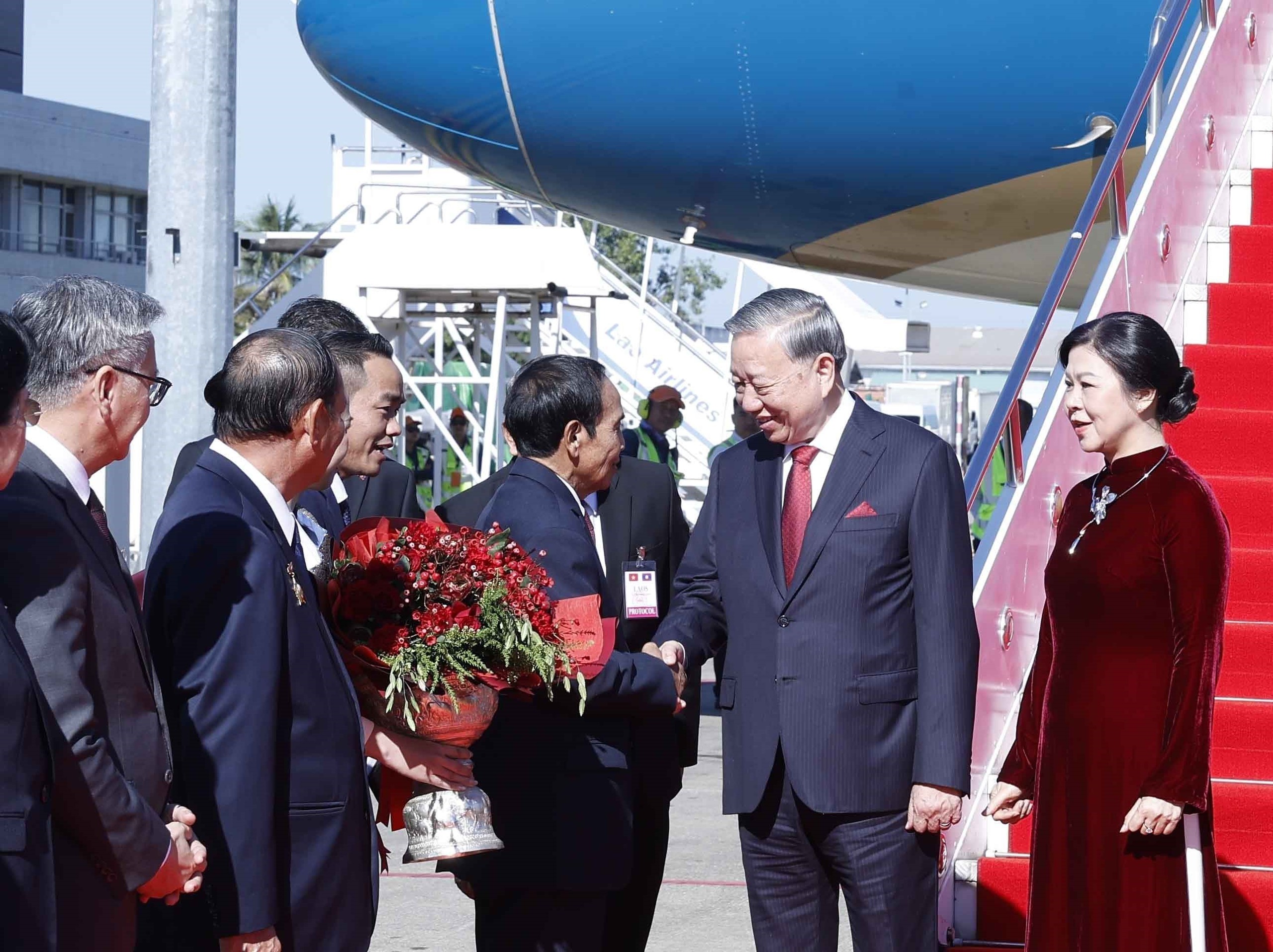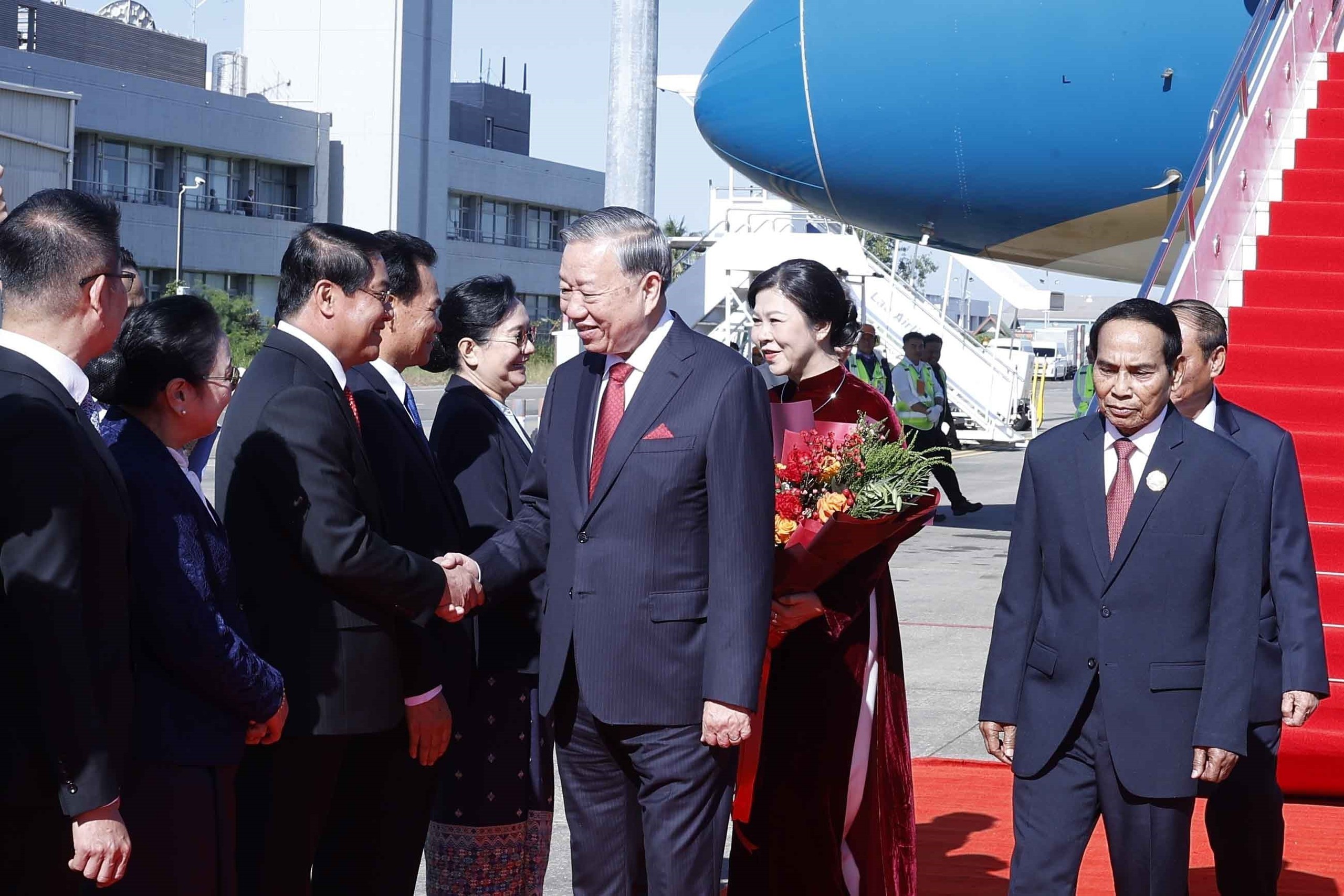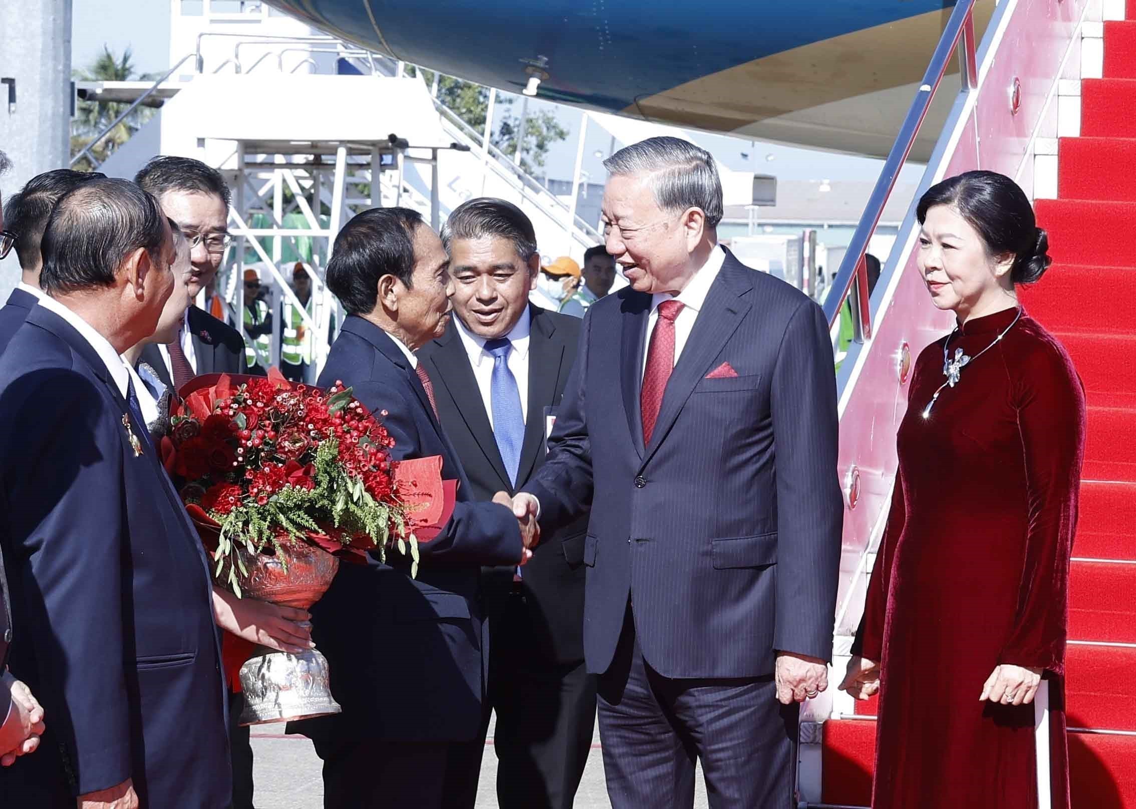 Đón Tổng Bí thư Tô Lâm và Phu nhân, cùng Đoàn đại biểu cấp cao Việt Nam tại sân bay quốc tế Wattay, phía Lào có các đồng chí: Bounthong Chitmany - Ủy viên Bộ Chính trị, Thường trực Ban Bí thư, Phó Chủ tịch nước Lào; Vilay Lakhamphong - Ủy viên Bộ Chính trị, Phó Thủ tướng Chính phủ, Bộ trưởng Bộ Công an Lào; Khemmani Pholsena - Ủy viên Trung ương Đảng, Chủ nhiệm Văn phòng Chủ tịch nước; Phet Phomphiphak - Ủy viên Trung ương Đảng, Chánh văn phòng Trung ương Đảng; Thongsavanh Phomvihane - Ủy viên Trung ương Đảng, Bộ trưởng Bộ Ngoại giao; Atsaphangthong Siphandone - Ủy viên Trung ương Đảng, Đô trưởng Thủ đô Viêng Chăn; Valaxay Lengsavad - Phó Trưởng Ban Đối ngoại Trung ương Đảng; Khamphao Ernthavanh - Đại sứ Lào tại Việt Nam; Outtama Sithipong - Vụ trưởng Vụ Lễ tân, Bộ Ngoại giao Lào.