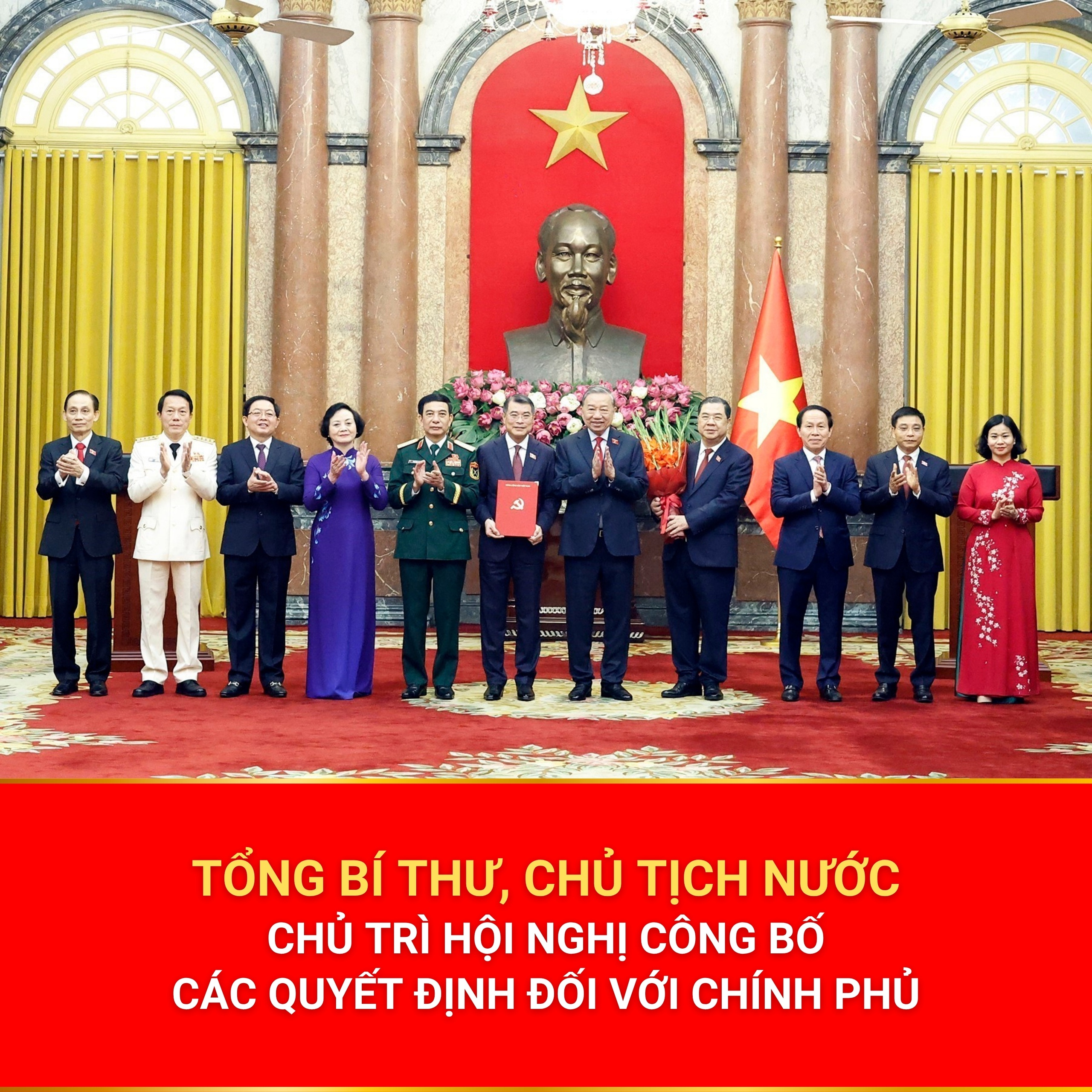 Tổng Bí thư, Chủ tịch nước cũng đã trao Quyết định bổ nhiệm các đồng chí Bộ trưởng và Thủ trưởng cơ quan ngang bộ gồm: Đại tướng Lương Tam Quang, Bộ trưởng Bộ Công an; Lê Hoài Trung, Bộ trưởng Bộ Ngoại giao; Đỗ Thanh Bình, Bộ trưởng Bộ Nội vụ; Ngô Văn Tuấn, Bộ trưởng Bộ Tài chính; Hoàng Thanh Tùng, Bộ trưởng Bộ Tư pháp; Lê Mạnh Hùng, Bộ trưởng Bộ Công Thương; Lâm Thị Phương Thanh, Bộ trưởng Bộ Văn hóa, Thể thao và du lịch; Trần Hồng Minh, Bộ trưởng Bộ Xây dựng; Hoàng Minh Sơn, Bộ trưởng Bộ Giáo dục và Đào tạo; Vũ Hải Quân, Bộ trưởng Bộ Khoa học và Công nghệ; Đào Hồng Lan, Bộ trưởng Bộ Y tế; Nguyễn Đình Khang, Bộ trưởng Bộ Dân tộc và Tôn giáo; Trịnh Việt Hùng, Bộ trưởng Bộ Nông nghiệp và Môi trường; Đặng Xuân Phong, Bộ trưởng, Chủ nhiệm Văn phòng Chính phủ; Phạm Đức Ấn, Thống đốc Ngân hàng Nhà nước; Nguyễn Quốc Đoàn, Tổng Thanh tra Chính phủ.