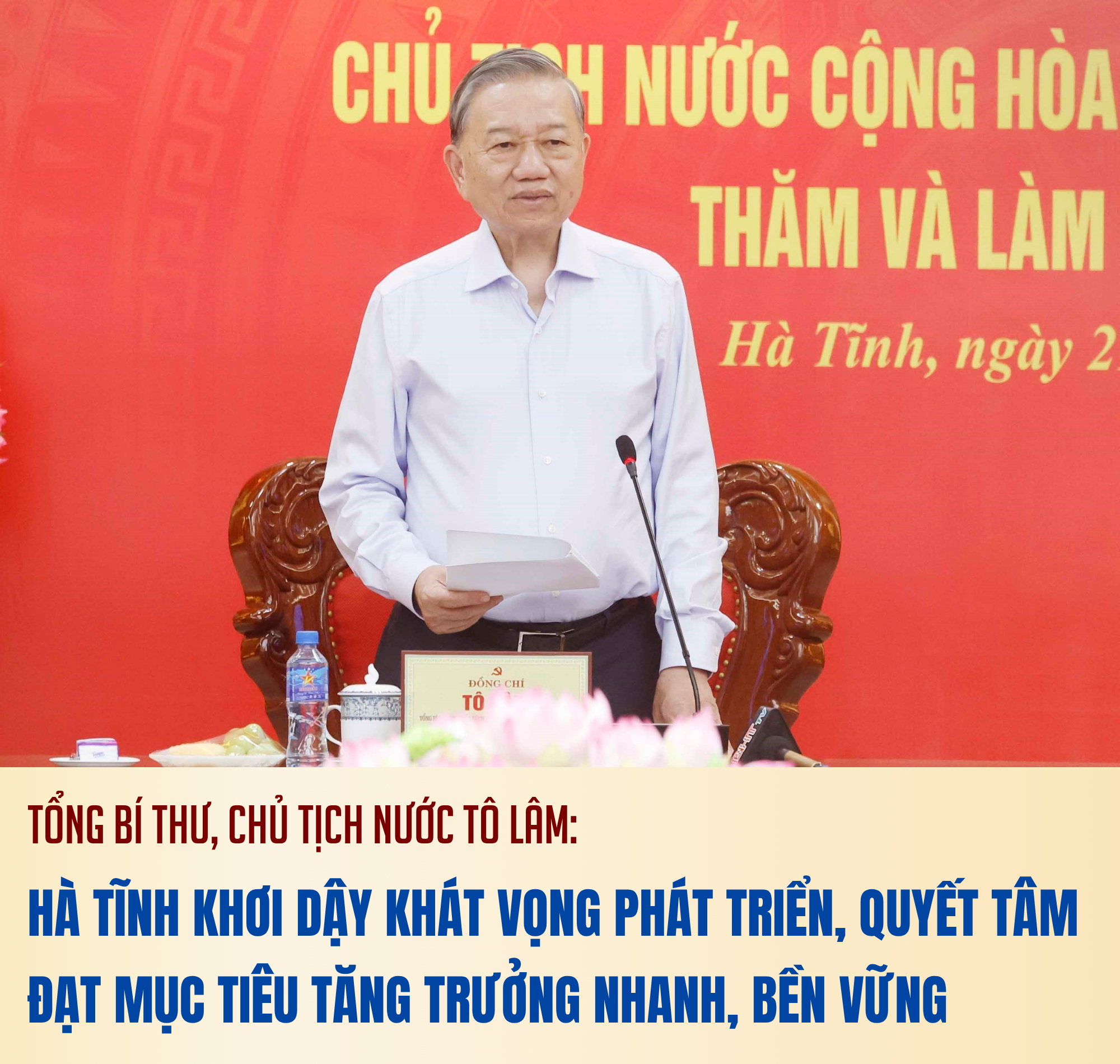 Hà Tĩnh - vùng đất giàu truyền thống cách mạng, kiên trung, hiếu học và nghĩa tình – đang đứng trước những cơ hội lớn trong chặng đường phát triển mới của đất nước. Với bản lĩnh, trí tuệ và khát vọng vươn lên, Tổng Bí thư, Chủ tịch nước tin tưởng, Đảng bộ, chính quyền và nhân dân Hà Tĩnh sẽ tiếp tục đoàn kết, đổi mới, phát huy tinh thần "tiếng trống Xô Viết Nghệ Tĩnh", vươn lên phát triển nhanh, toàn diện và bền vững, đóng góp xứng đáng vào sự phát triển chung của cả nước.
