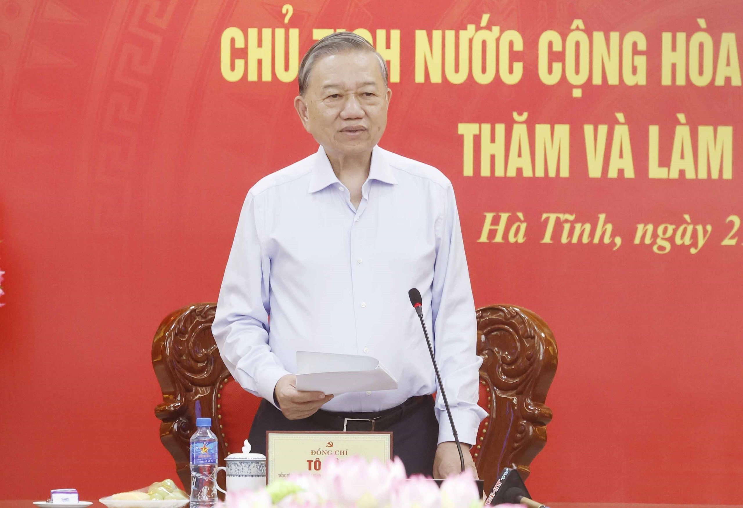 Sau khi nghe báo cáo của lãnh đạo tỉnh và các ý kiến trao đổi tại buổi làm việc, phát biểu kết luận, Tổng Bí thư, Chủ tịch nước Tô Lâm biểu dương và chúc mừng những kết quả quan trọng, toàn diện mà Đảng bộ, chính quyền và nhân dân Hà Tĩnh đã đạt được.